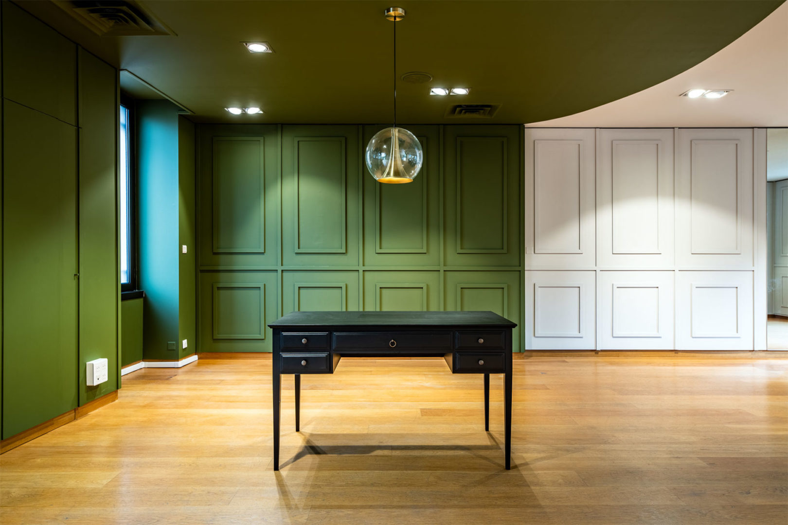 Eva est intervenue sur les deux niveau de l’agence. Elle a conçu une grande salle de réunion au premier. Hyper élégante avec ce mélange de droites et de courbes et ces tons froids et chauds qui se superposent. L’ambiance est vraiment très class et respecte l’esprit Haussmannien des lieux. Le rez de chaussée qui accueille les clients a totalement été repensé et c’est très réussi, je vous laisse juger !