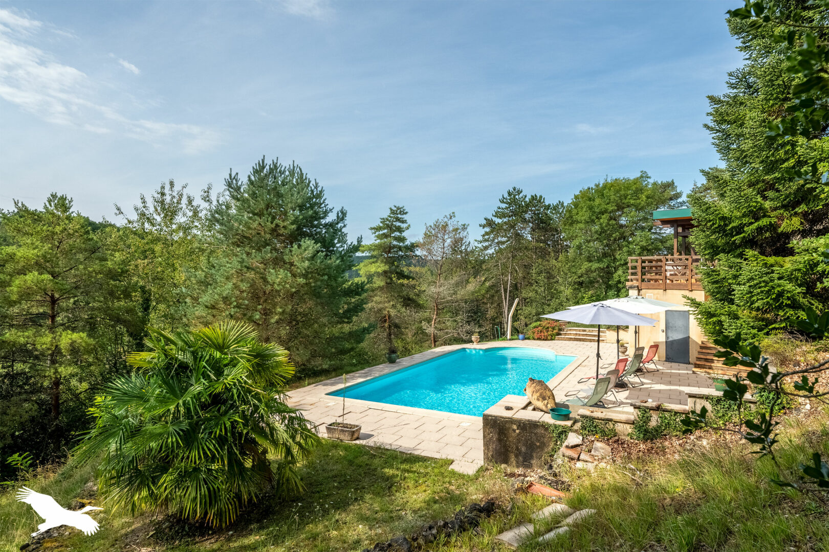 En effet, depuis le grand séjour on domine la vallée tout en étant à l’abri derrière les arbres, l’esprit cabane dans les arbres qui donne à cette villa des airs de maison de vacance. Surtout qu’aujourd’hui il y a du soleil (intermittent) et la piscine brille au milieu de tout ce vert. Ça donne envie de piquer une tête.
