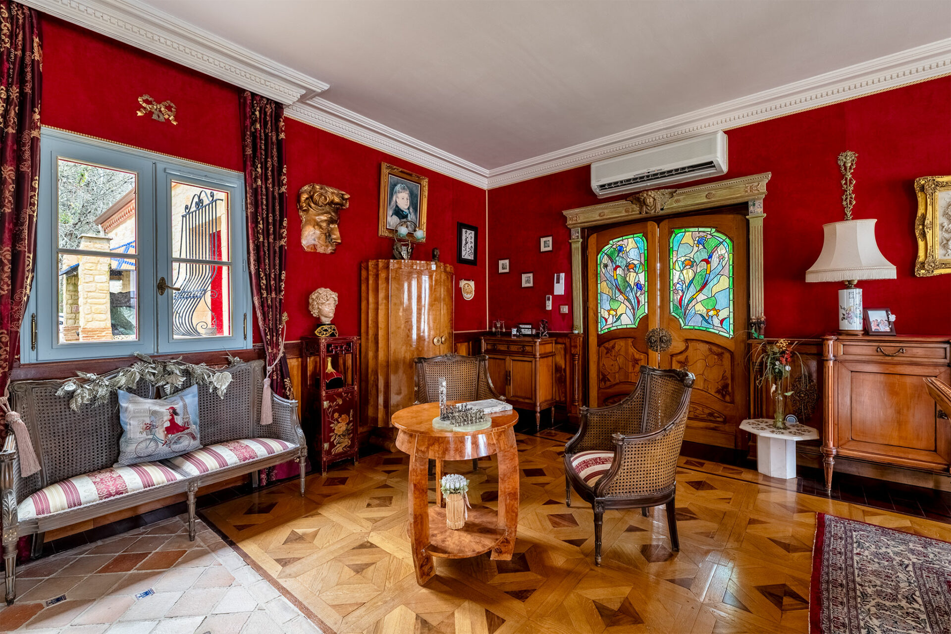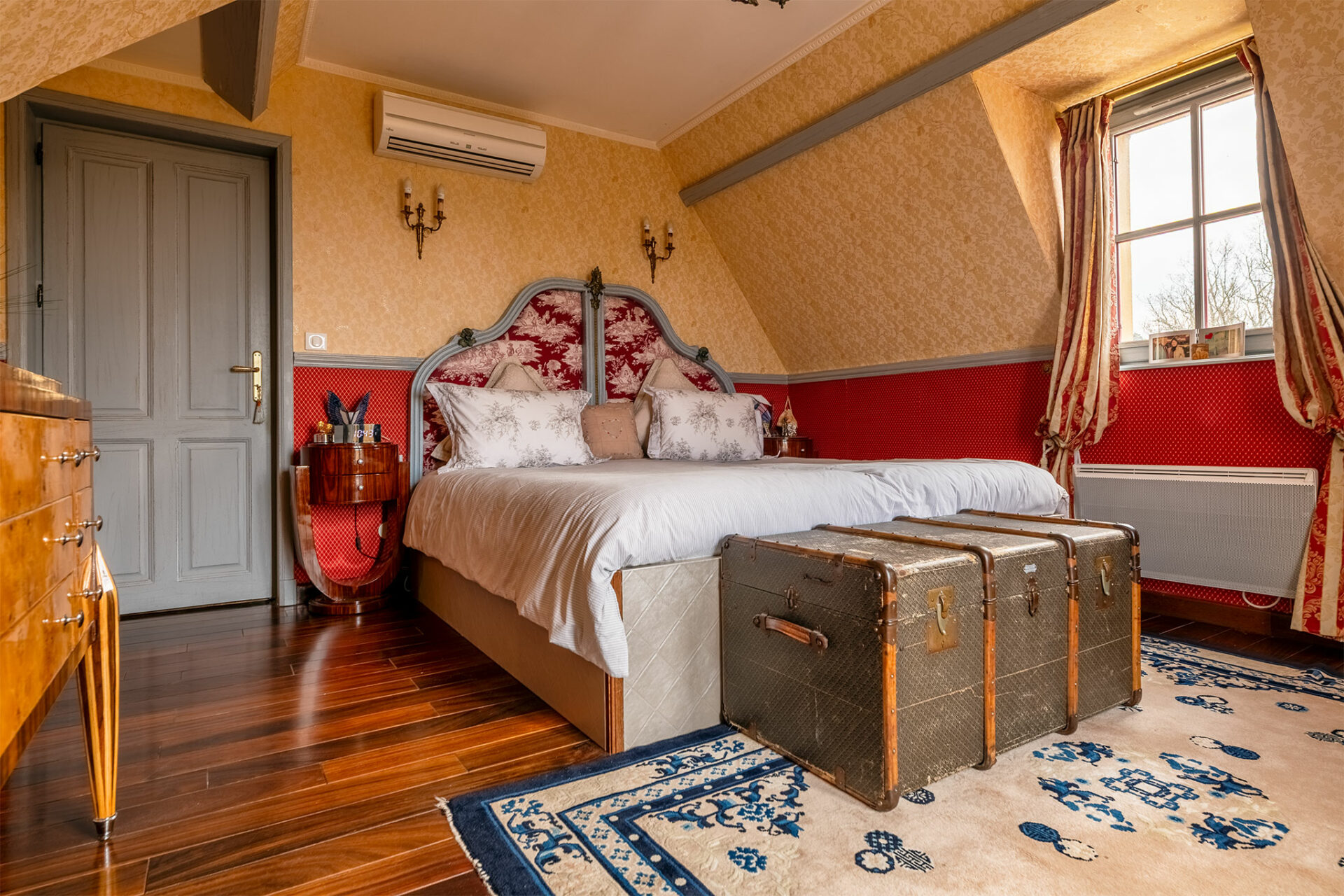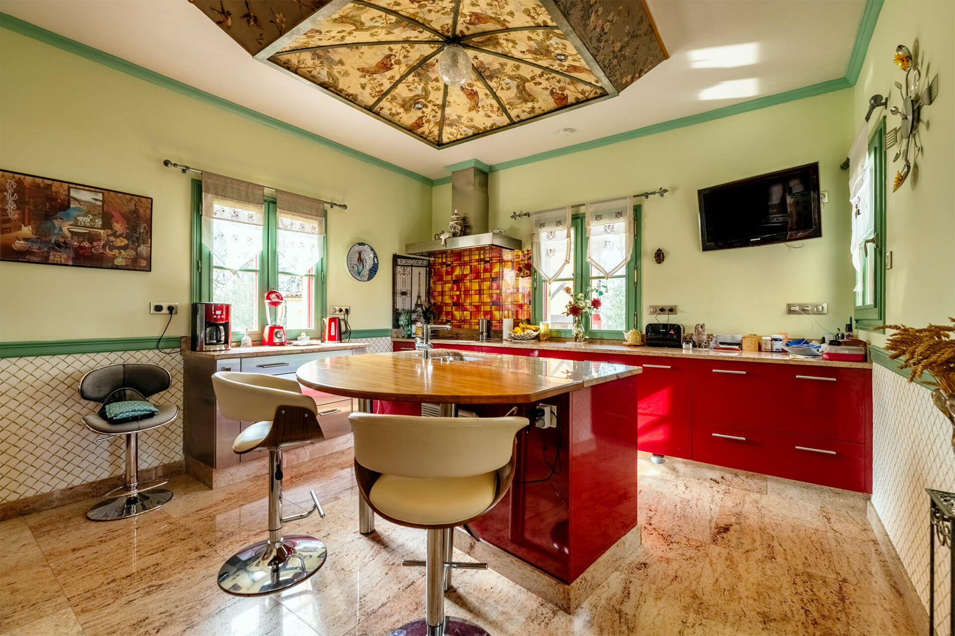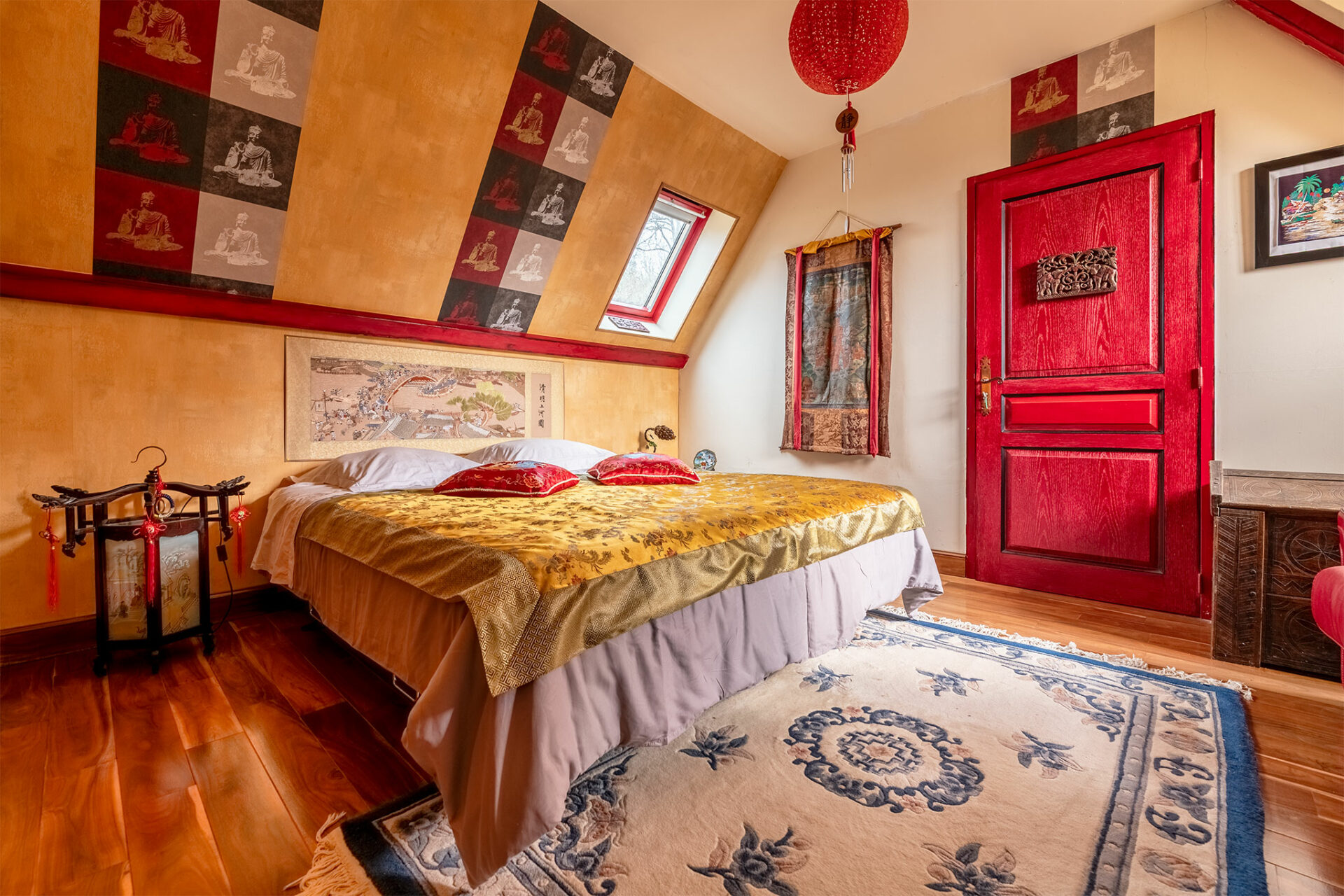 Il s’agit donc d’un petit domaine qui surplombe un joli panorama englobant le château des Milandes. La piscine a été vidée, c’est dommage, mais le charme opère tout de même. Nous sommes en présence d’une jolie périgourdine à l’allure massive et solide des demeures en pierres. Donc on est plutôt sur du traditionnel, mais le tradi s’arrête dès que l’on franchit la porte pour laisser place à une explosion de couleurs… Je vous laisse profiter du spectacle :