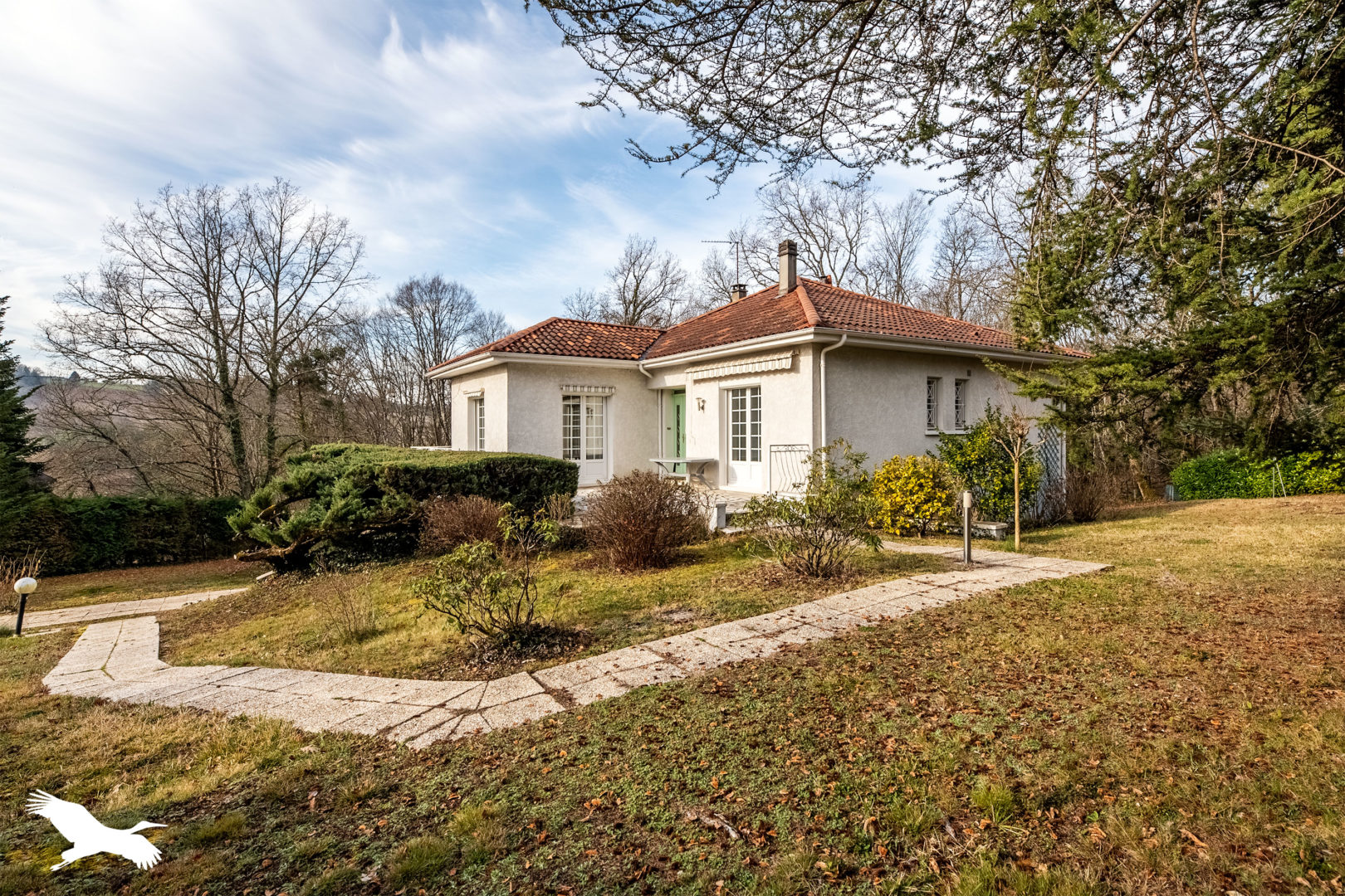 C’est l’hiver, les arbres manquent de vert mais malgré tout le jardin reste tout à fait agréable. Le pavillon est très sympa, je le pensais de prime abord plus récent mais il m’a été confirmé que la maison date de 1971. Il faut croire que l’architecte était un peu visionnaire.