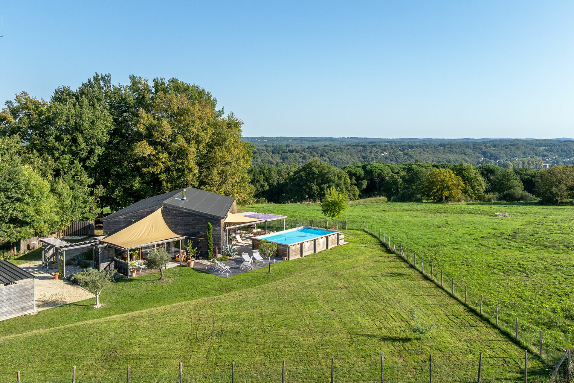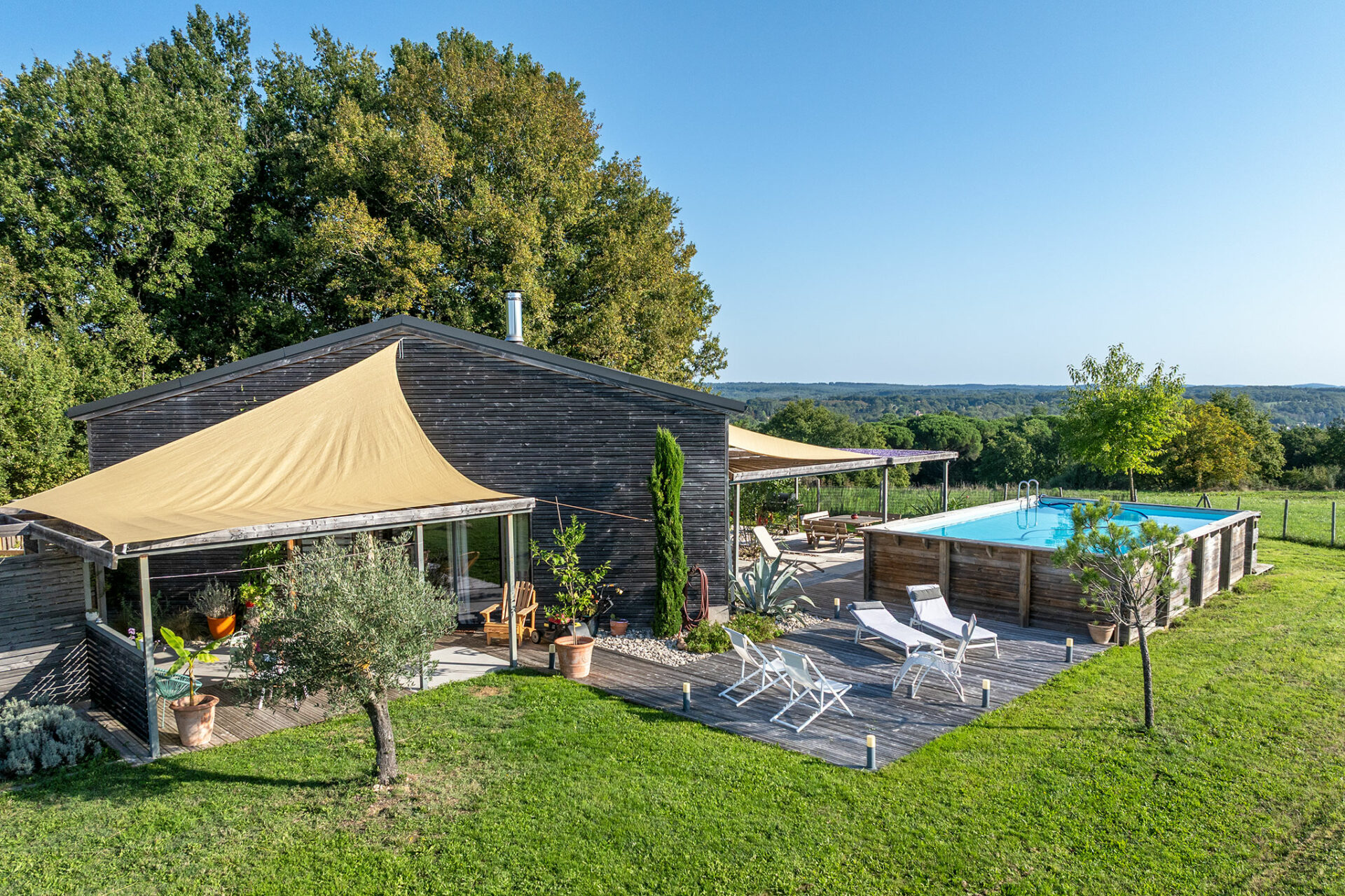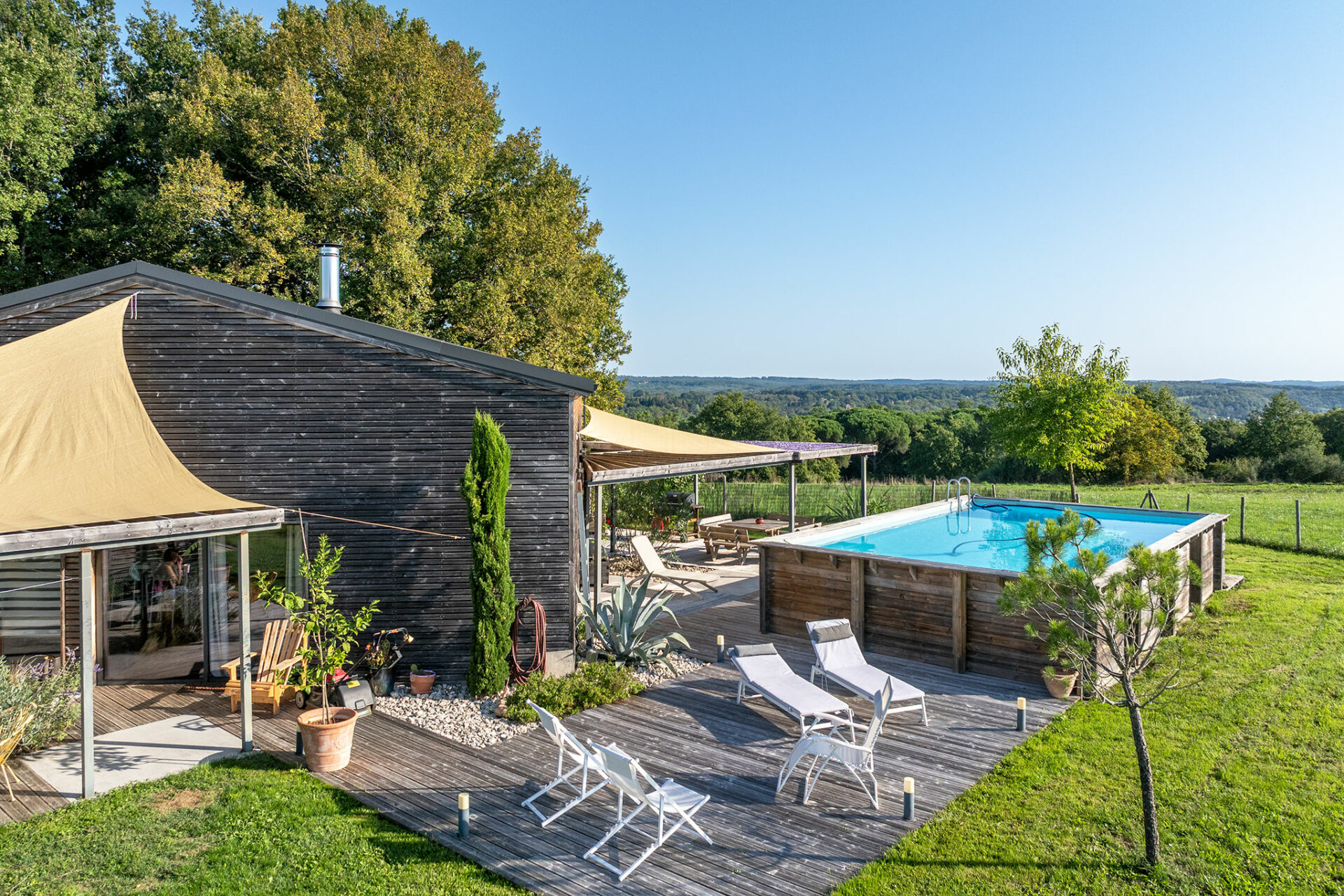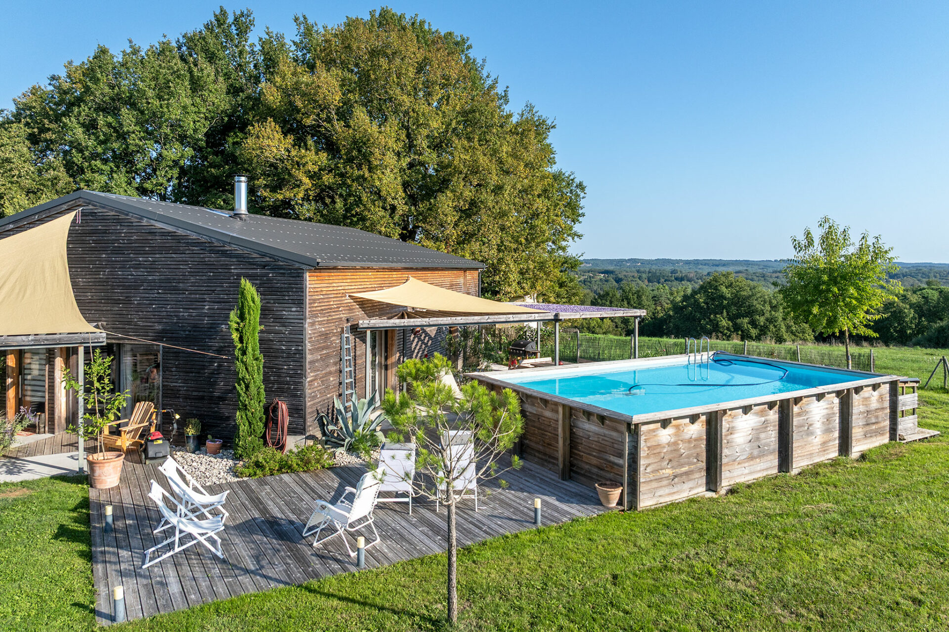 C’est une jolie villa en bois, très moderne dans sa conception, située sur un des points les plus hauts autour de de Couze. La vue est très sympa, pas de voisin visible, juste des arbres et le village au loin.
