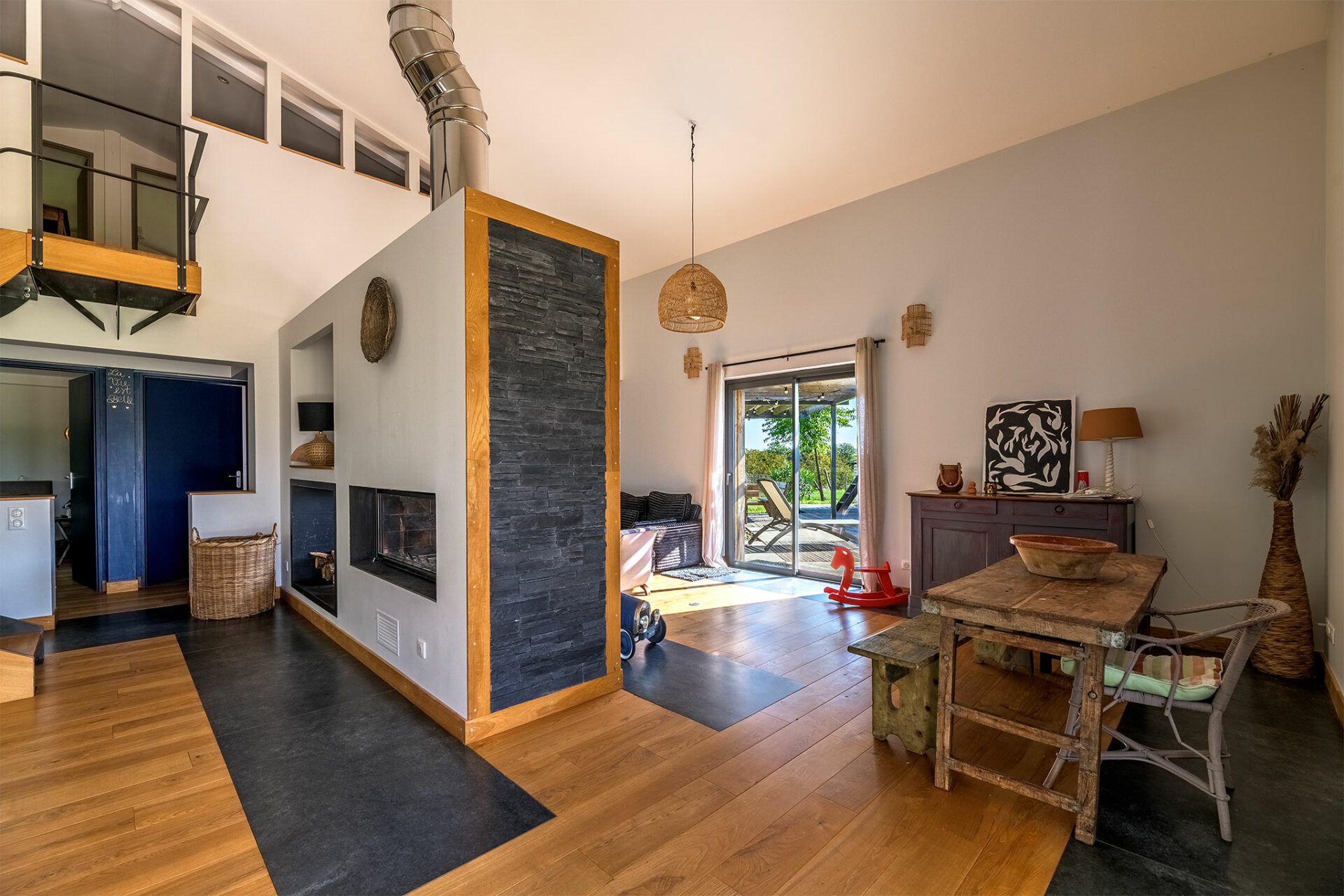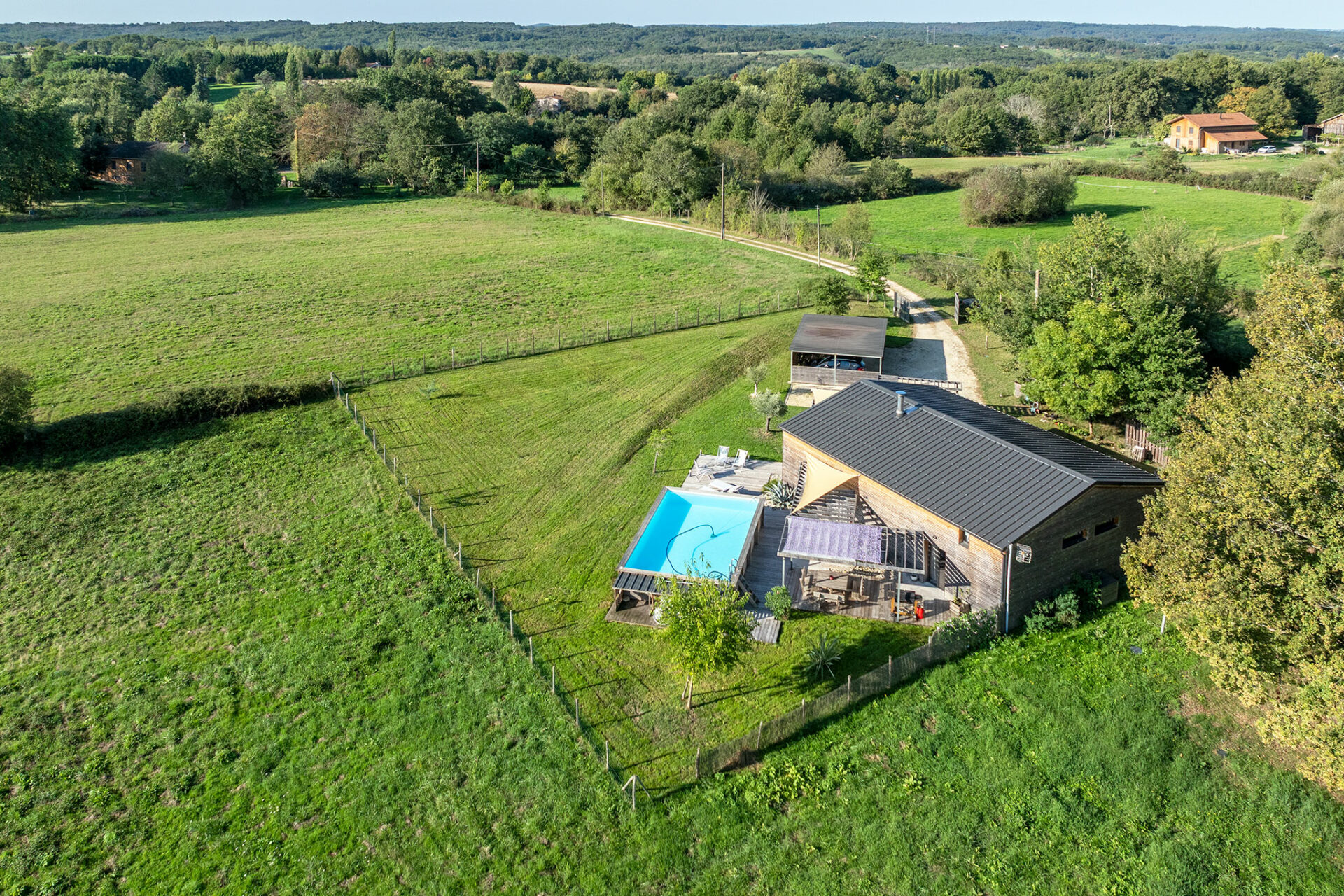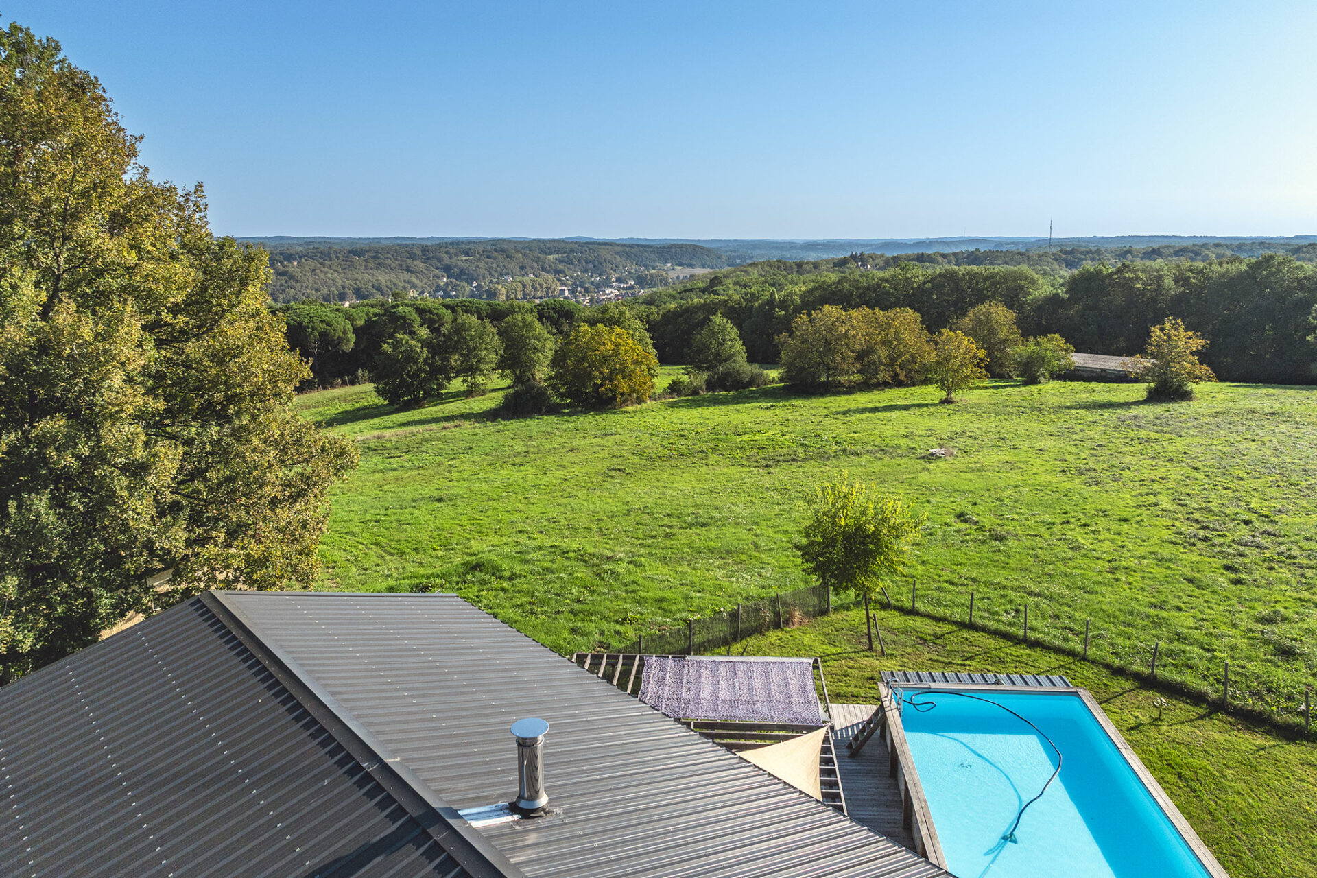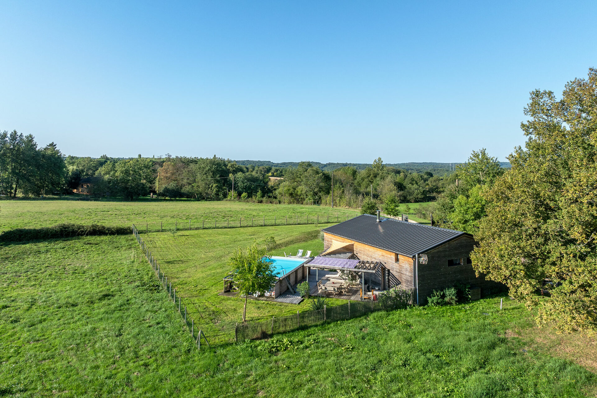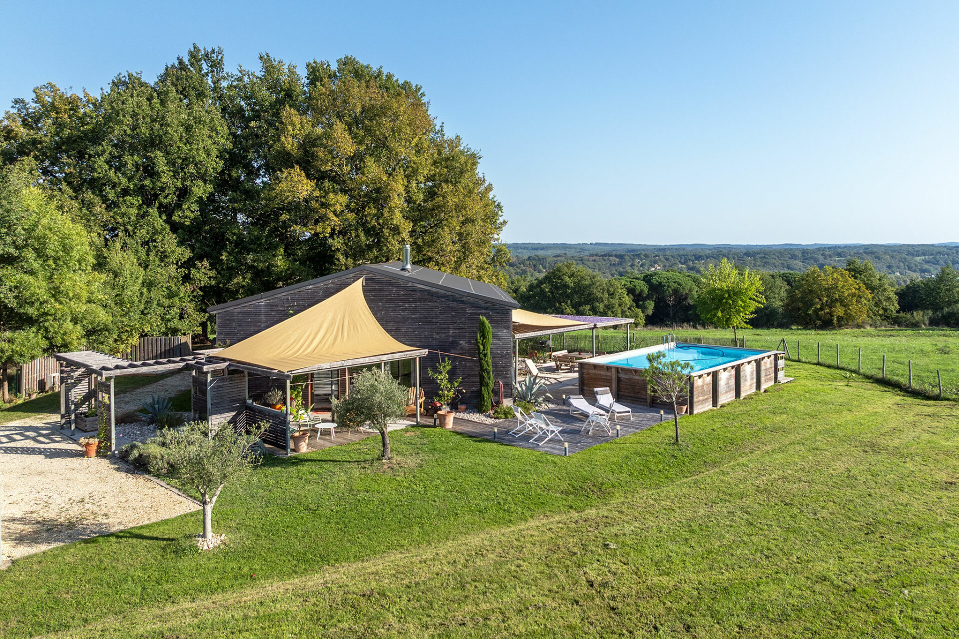 C’est une jolie villa en bois, très moderne dans sa conception, située sur un des points les plus hauts autour de de Couze. La vue est très sympa, pas de voisin visible, juste des arbres et le village au loin.