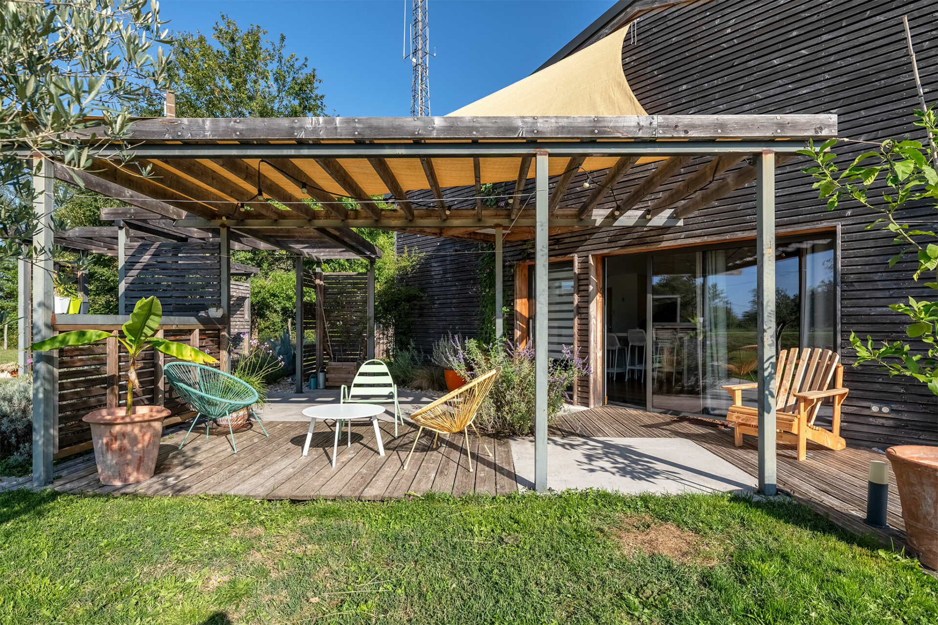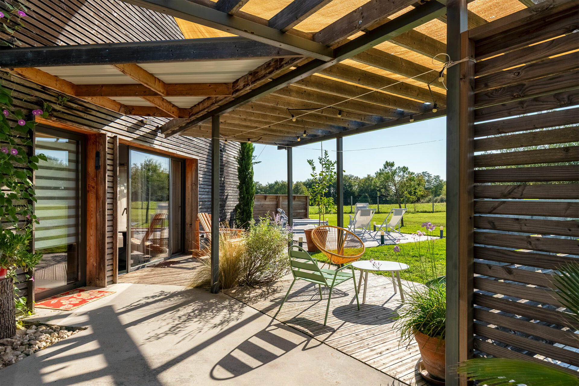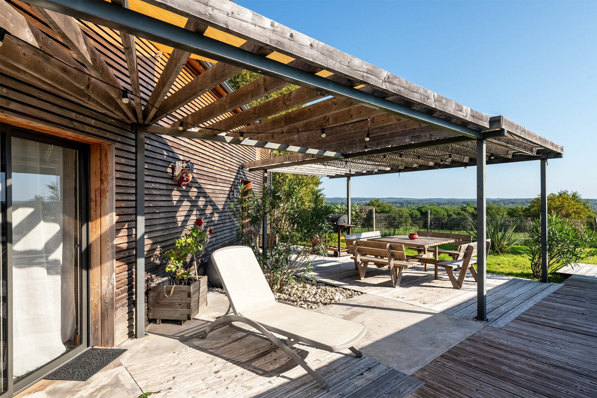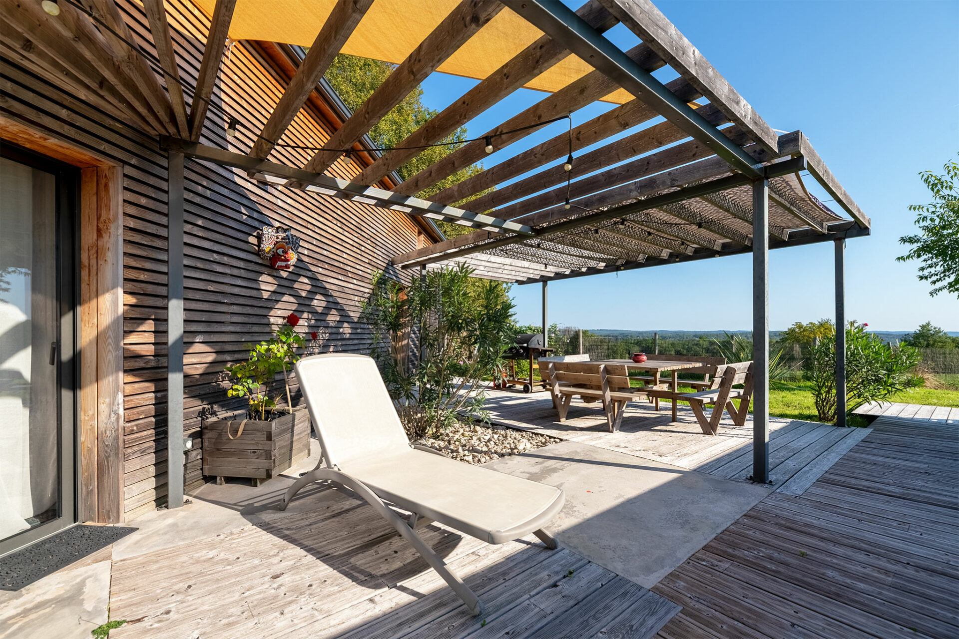 Le lieu est très paisible. Une antenne se dresse à proximité mais c’est juste un relais radio des sapeurs pompiers. C’est un grand carport qui nous accueille à l’entrée. La villa nous offre un accueil ombragé grâce à une charmante pergola. Une porte d’entrée conduit à la cuisine mais je décide de faire le tour de la maison pour profiter de la vue, du calme et de la terrasse ombragée qui se prolonge tout autour de la baie vitrée du séjour.