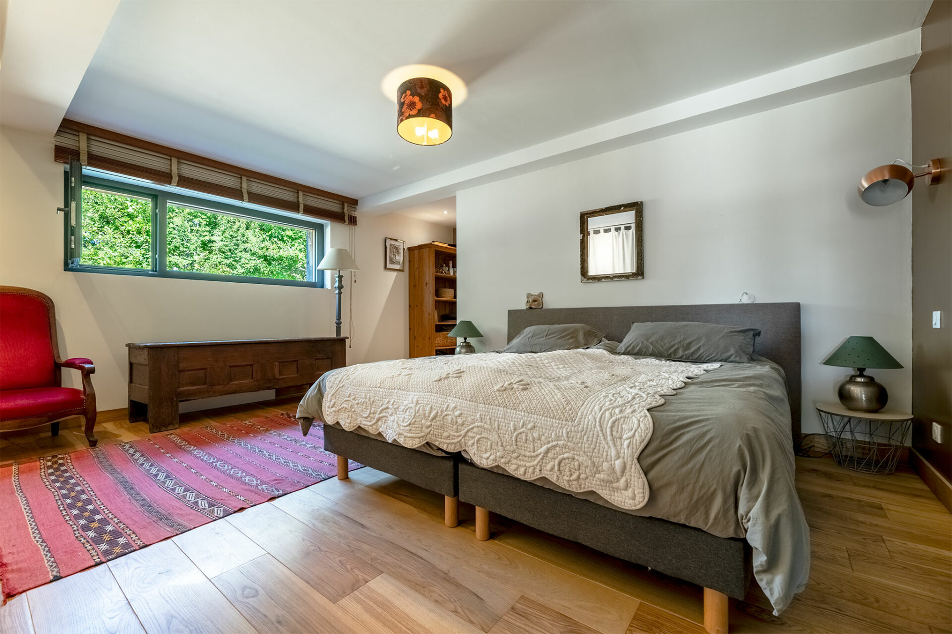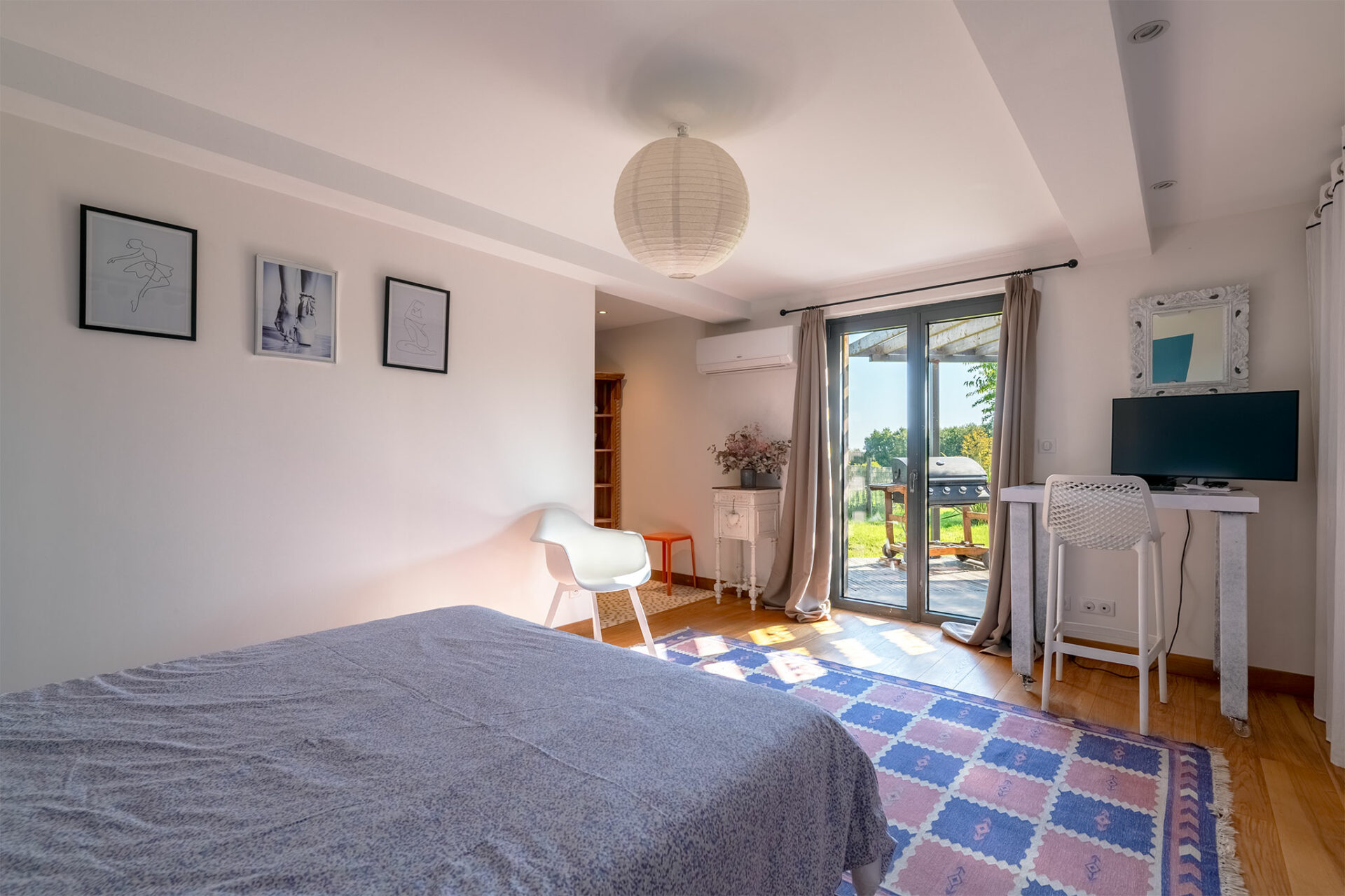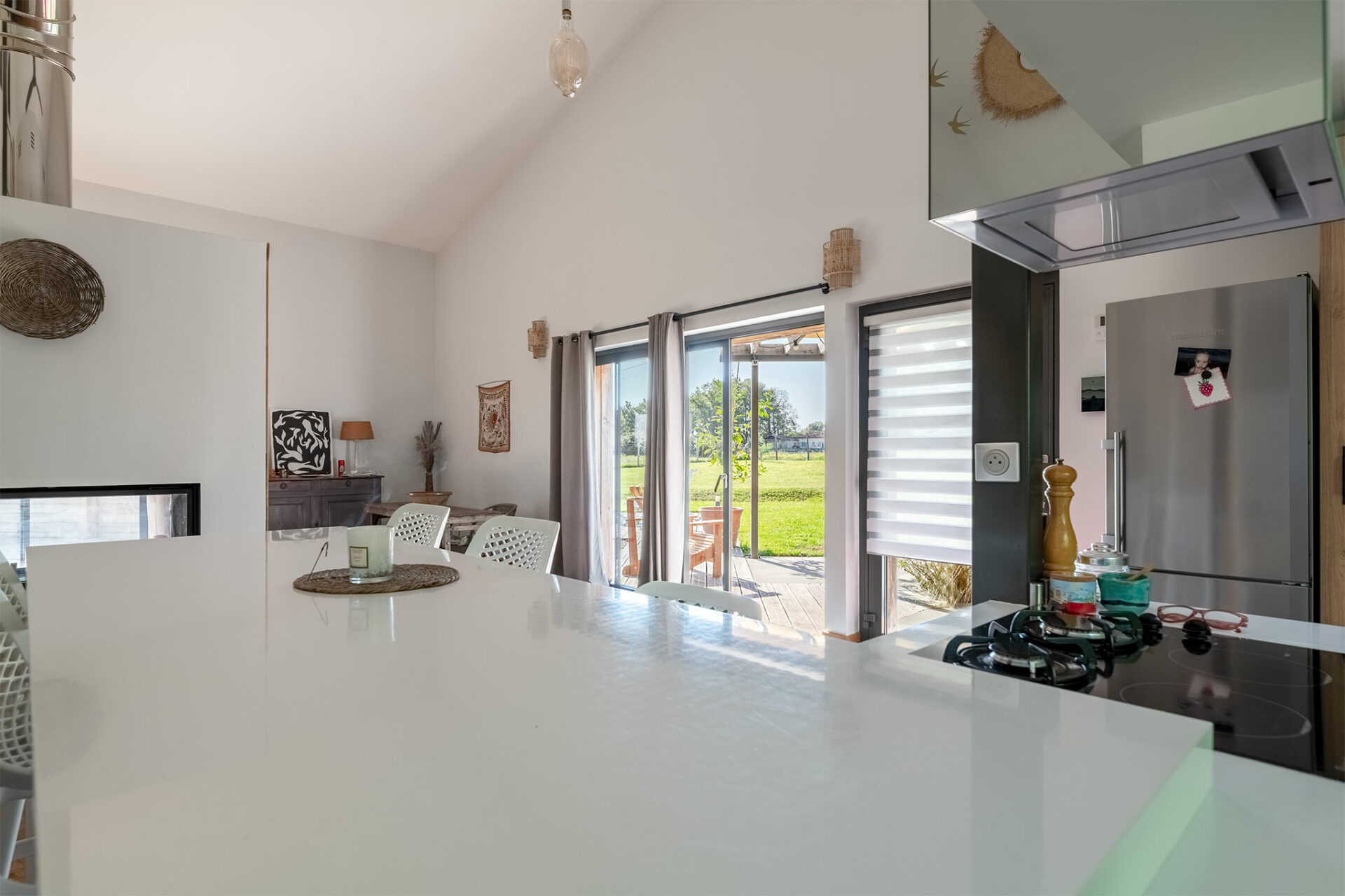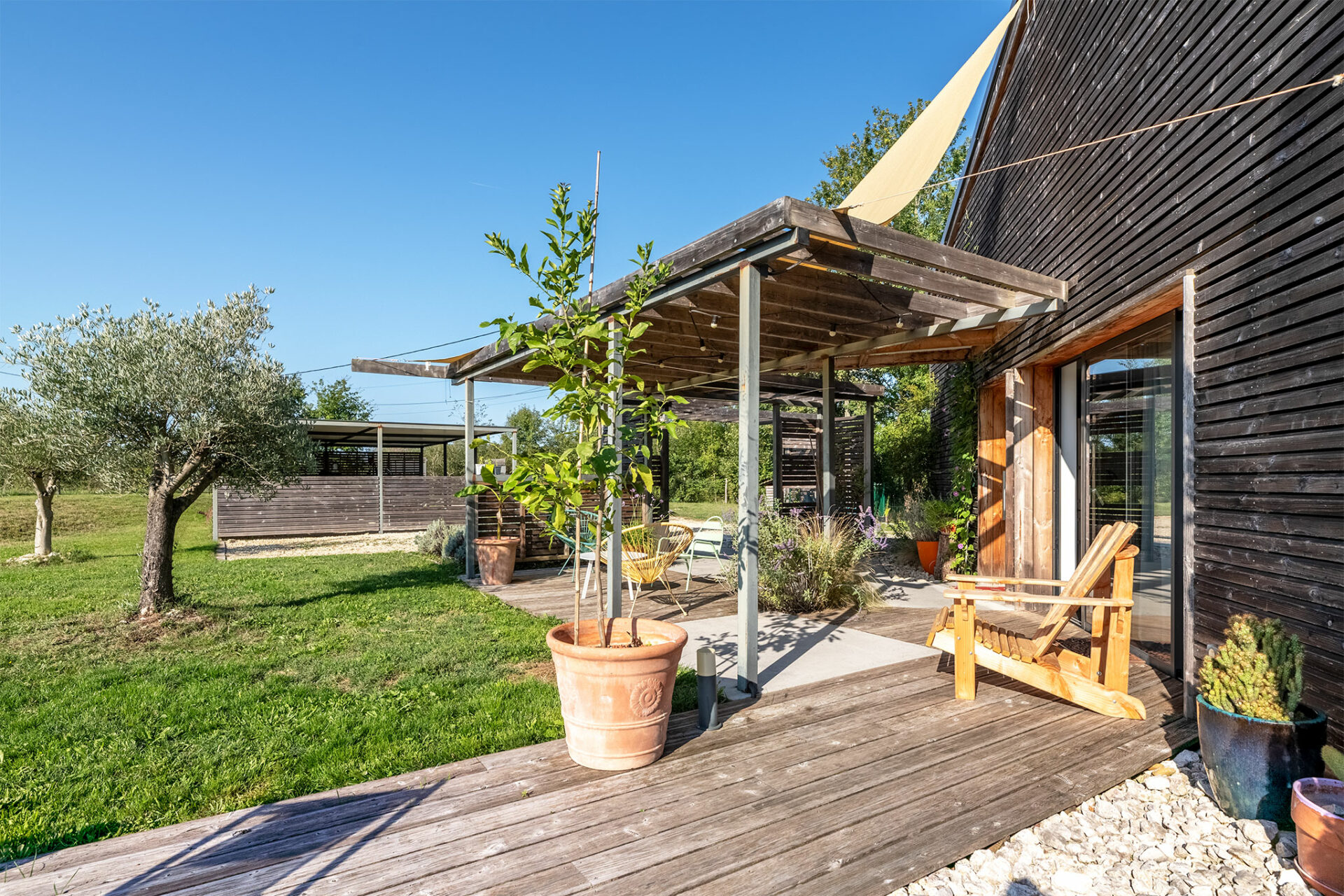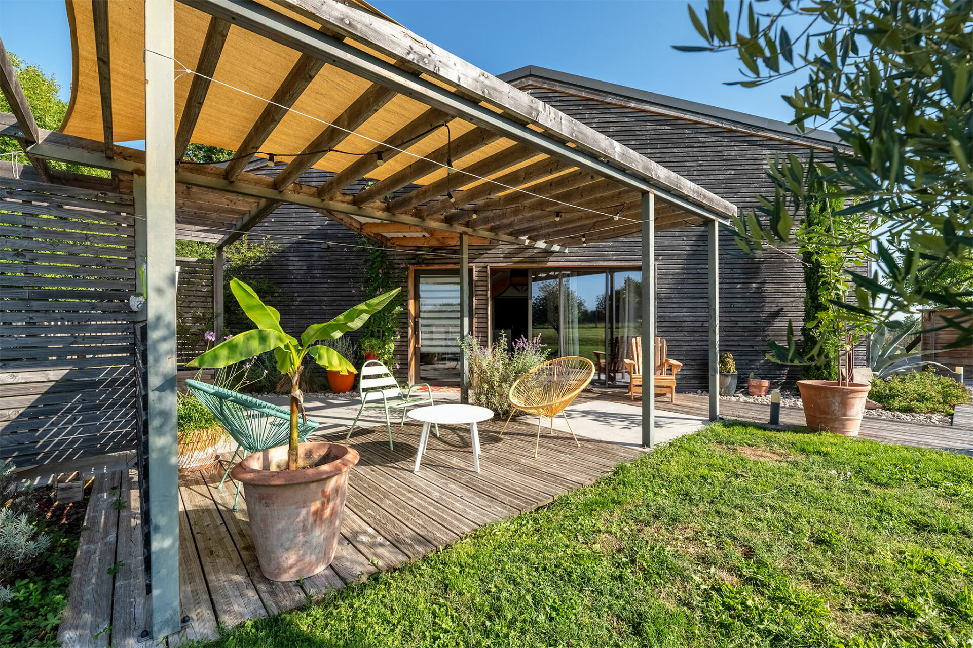 Le lieu est très paisible. Une antenne se dresse à proximité mais c’est juste un relais radio des sapeurs pompiers. C’est un grand carport qui nous accueille à l’entrée. La villa nous offre un accueil ombragé grâce à une charmante pergola. Une porte d’entrée conduit à la cuisine mais je décide de faire le tour de la maison pour profiter de la vue, du calme et de la terrasse ombragée qui se prolonge tout autour de la baie vitrée du séjour.