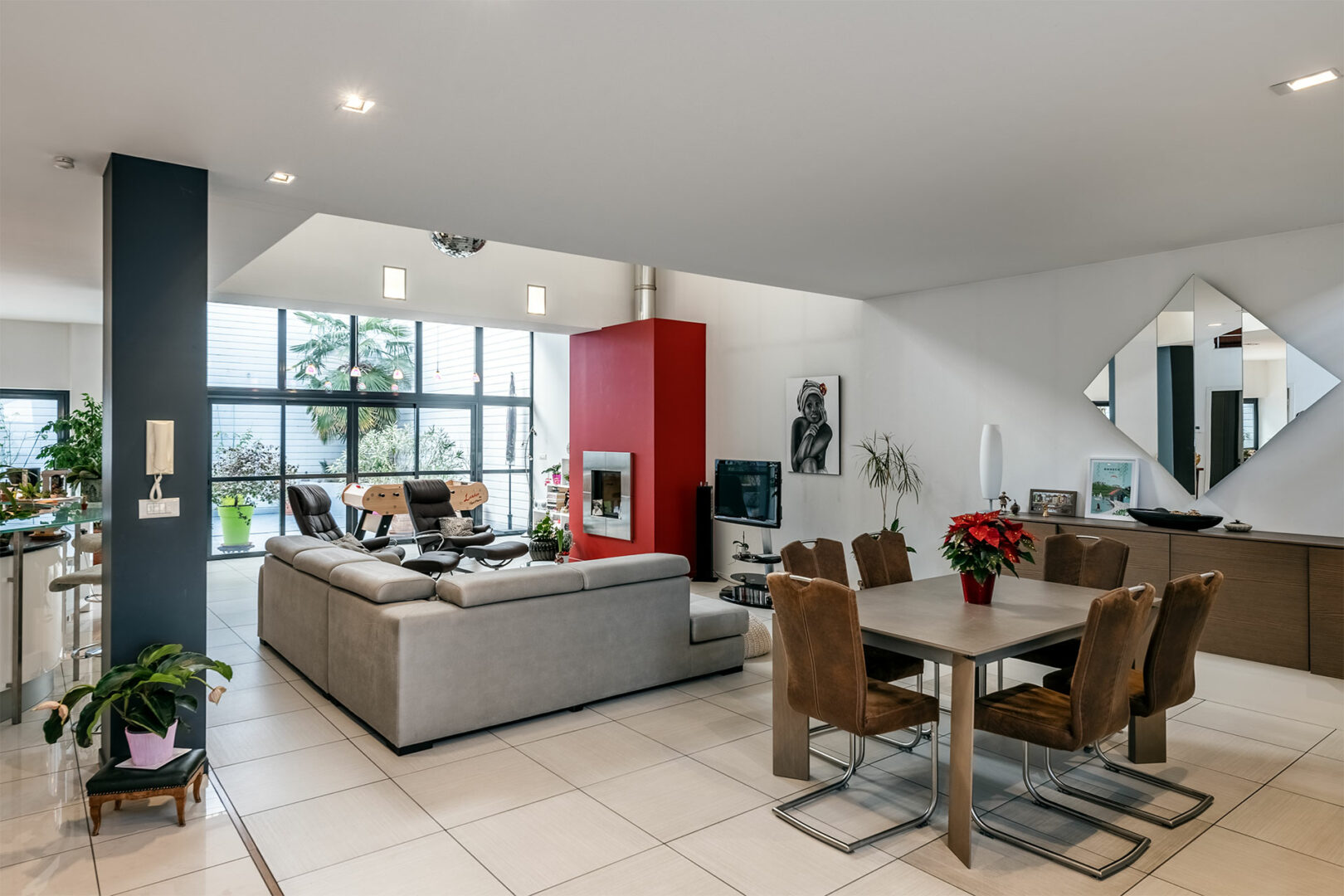 Quelques marches mènent à l’immense pièce de vie d’un seul tenant. C’est très moderne, épuré et éclairé par une gigantesque baie vitrée donnant sur un grand patio.