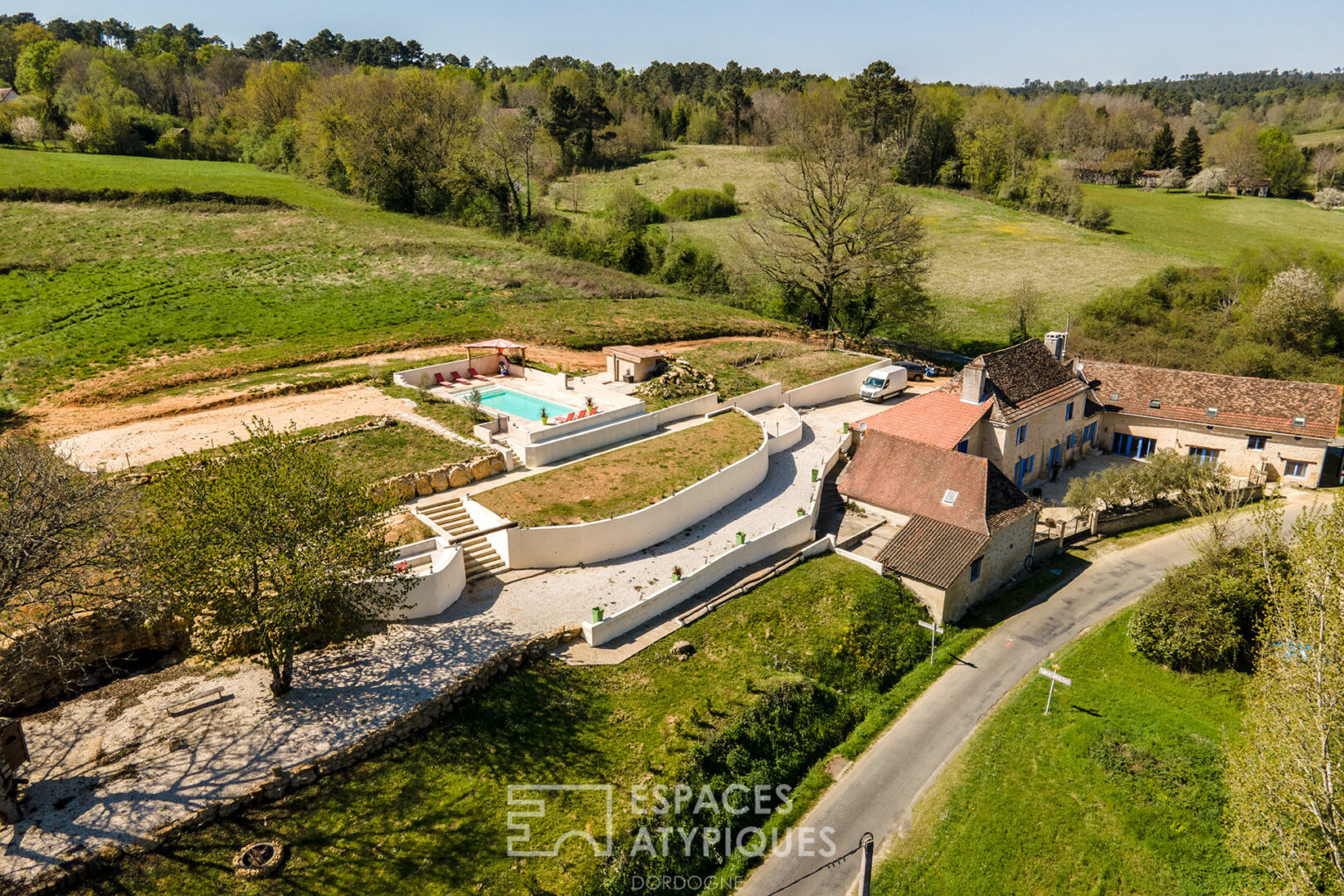 Pour la première fois la Kangoo va mettre ses pneus sur les sentiers de Saint Jean d’Eyraud afin de réaliser un reportage immobilier. Jamais je ne serai de moi même passé ici, ou alors en me perdant, mais il se trouve que c’est pourtant très charmant. Je me doutais que la propriété serait sympa car au catalogue d’Espaces Atypiques Dordogne.