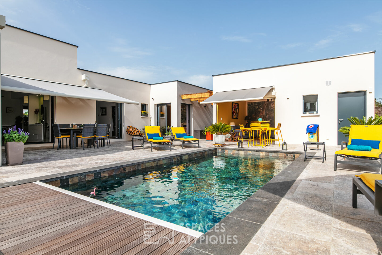 Marion Lemaire d’Espaces Atypiques Dordogne me confie un reportage immobilier dans une villa contemporaine assez exceptionnelle. Ce qui frappe lorsqu’on entre sur la propriété c’est la douceur de vivre qui émane de ce lieu. Le jardin est richement fleuri, l’ambiance est aux vacances. Il émane de cette maison des vibrations chaleureuses qui invitent au repos et au farniente.