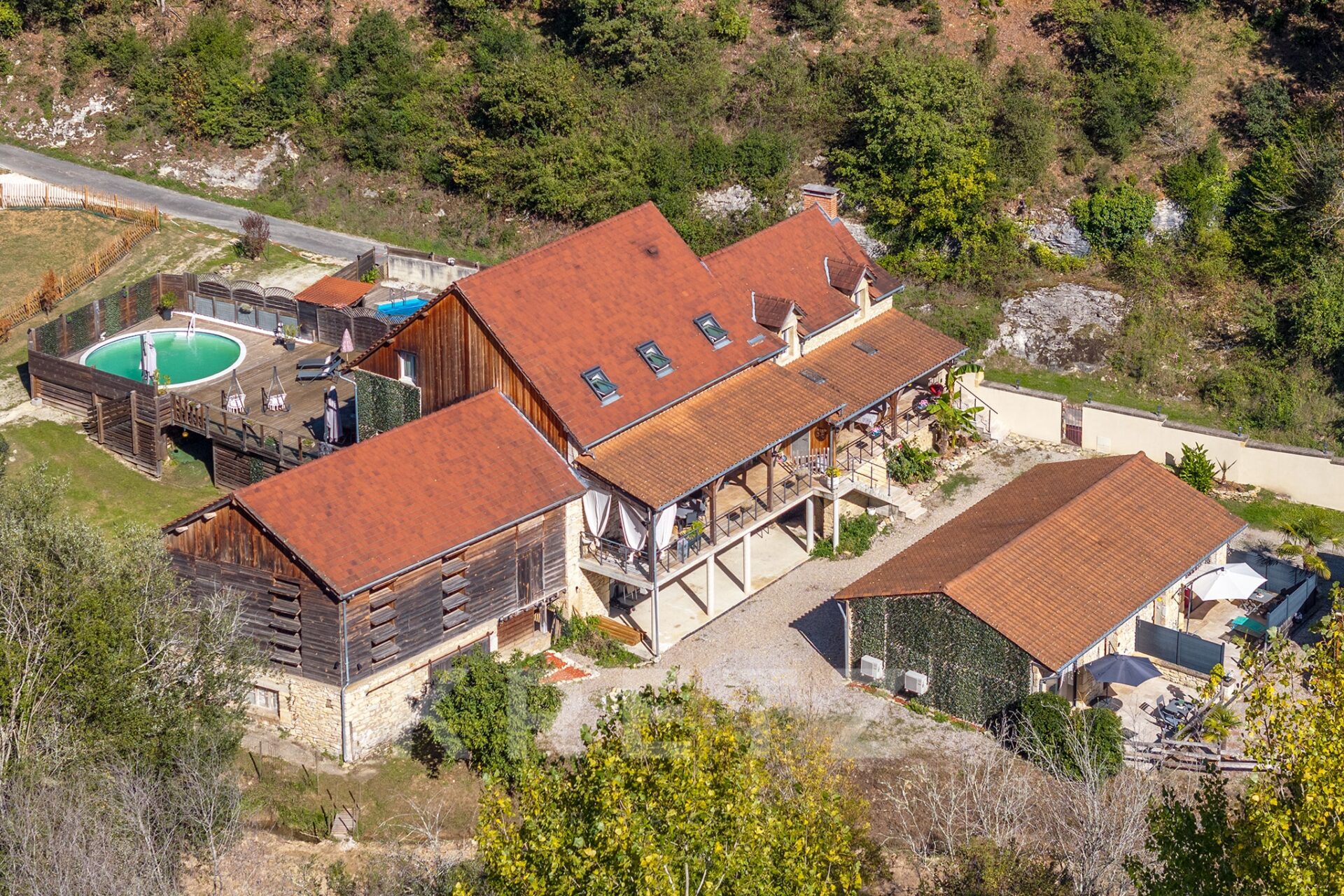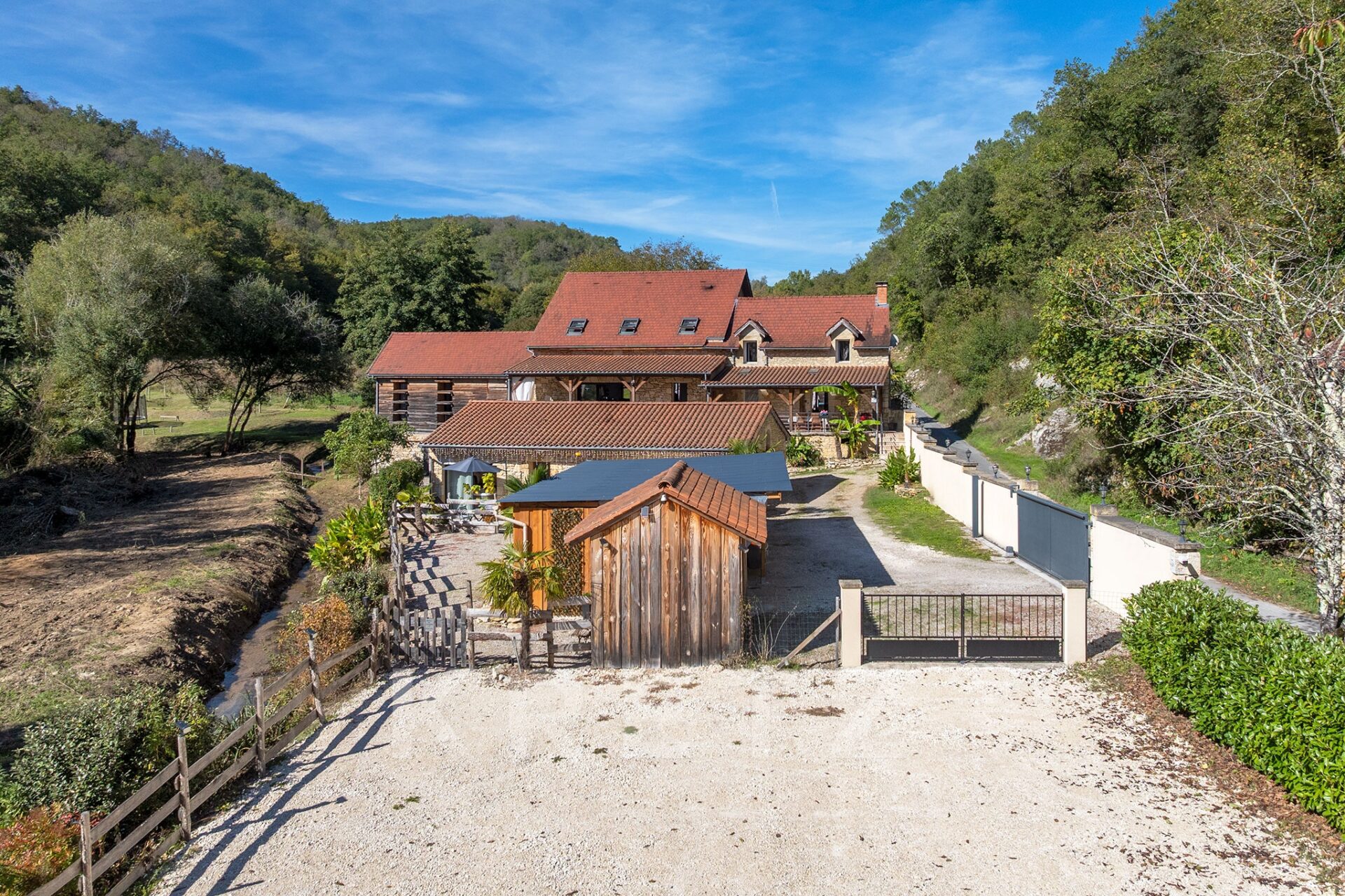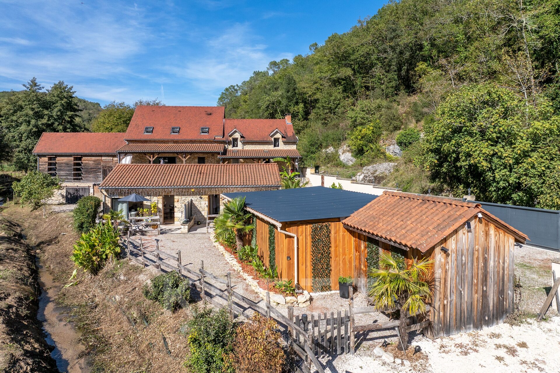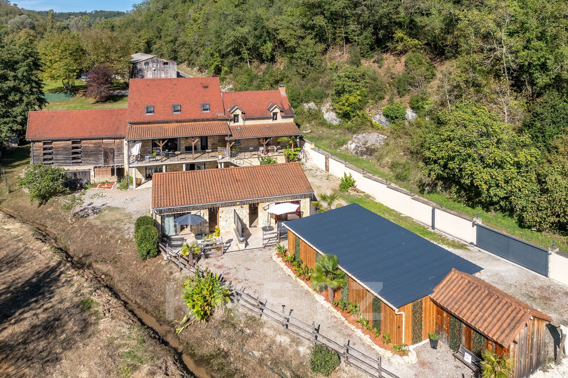 L’endroit est enchanteur, au milieu d’une petite vallée, à l’abri des intempéries. La vallée est idéalement orienté puisque le soleil inonde de sa lumière la propriété toute la journée. La propriété est constituée d’une maison en pierre séparée en deux afin d’y créer un premier gîte. Côté habitation des propriétaires on pourra noter que la suite parentale est aménagée dans un séchoir totalement rénové tout en conservant l’esprit originel du bâtiment.