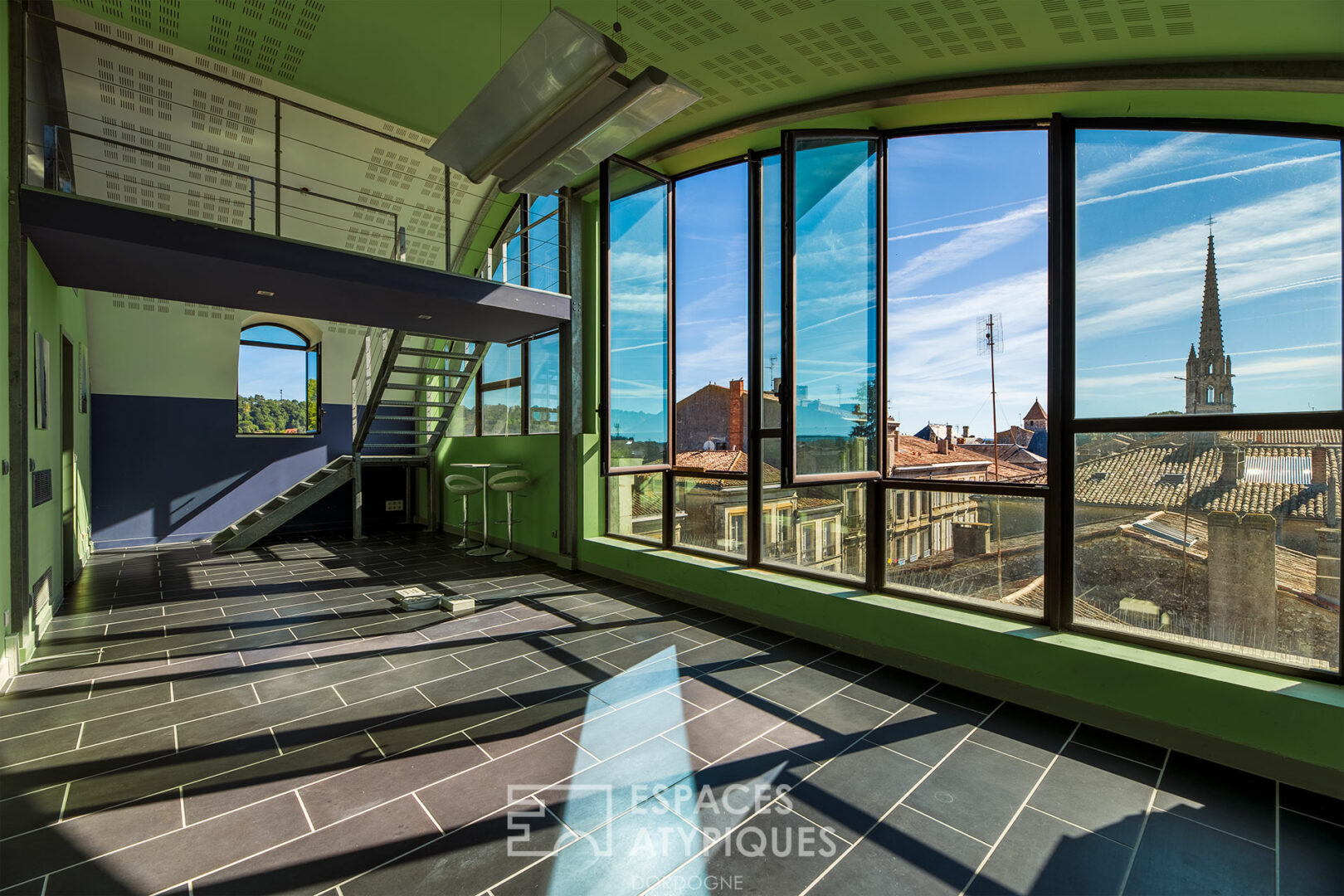 Un grand couloir permet la distribution vers plusieurs pièces dont une très grande qui pourrait très facilement faire une suite parentale avec dressing et salle de bain. Au bout du couloir vous débouchez sur la pièce principale qui offre une vue extraordinaire sur le centre ville. Un escalier mène vers une mezzanine et une seconde porte permet d’accéder dans l’une des pièces attenante à ce que je voyais comme une suite parentale. C’est lumineux, grand et en très bon état. Quelques travaux de peintures et de réaménagements sont à prévoir car on aménage pas un cabinet de dentiste comme on aménage un appartement, mais rien de très compliqué.