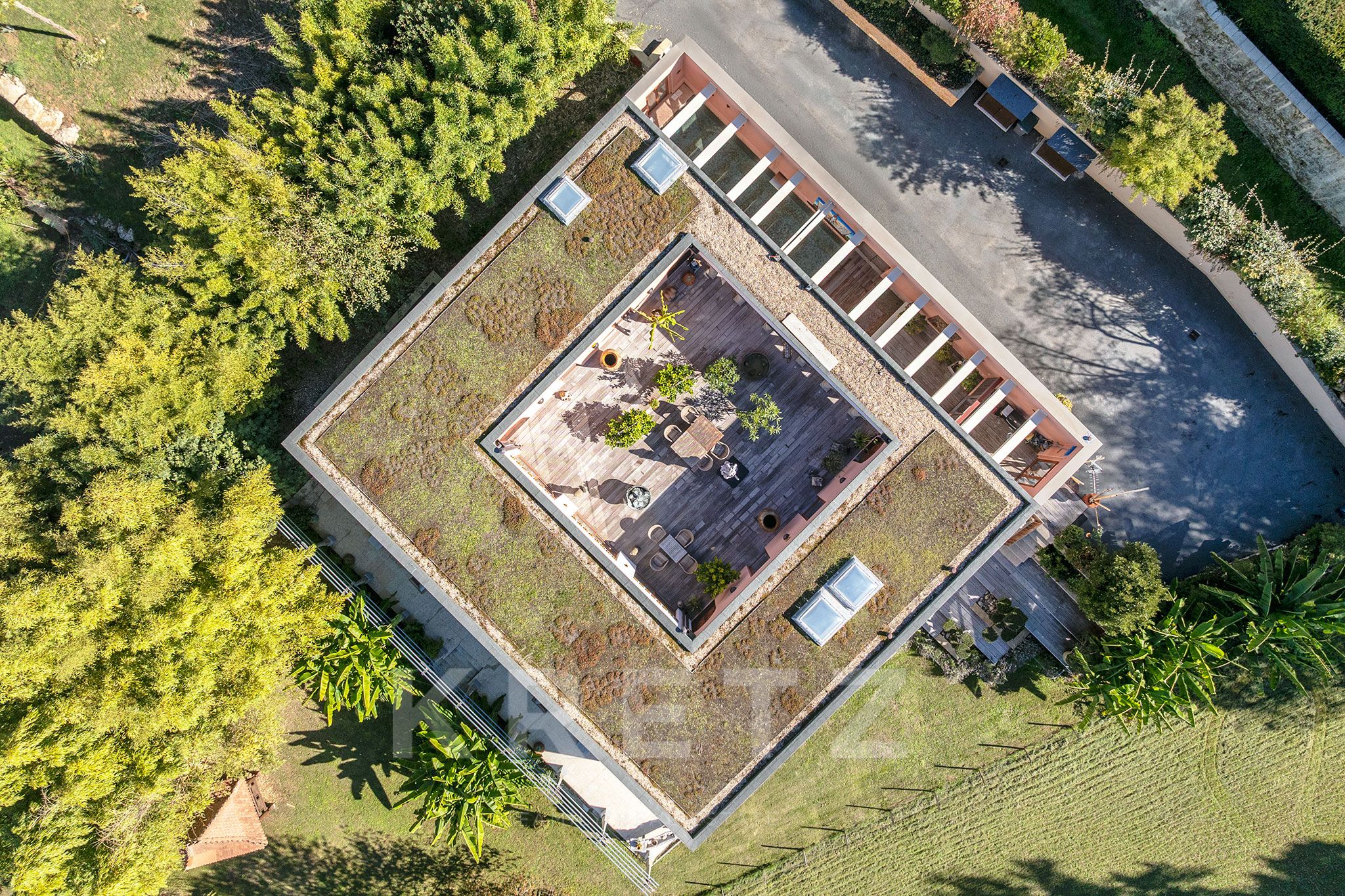 Cette maison est le fruit d’un architecte chargé de traduire en plans le fantasme de son propriétaire débordant d’imagination. Une maison qui serait le fruit d’un accouplement entre une villa brutaliste et un monastère contemporain. Un cube creusé en son centre, flanqué sur tous les côtés de fenêtres donnant une ambiance monacale à l’ensemble avec des huisseries en forme de croix.