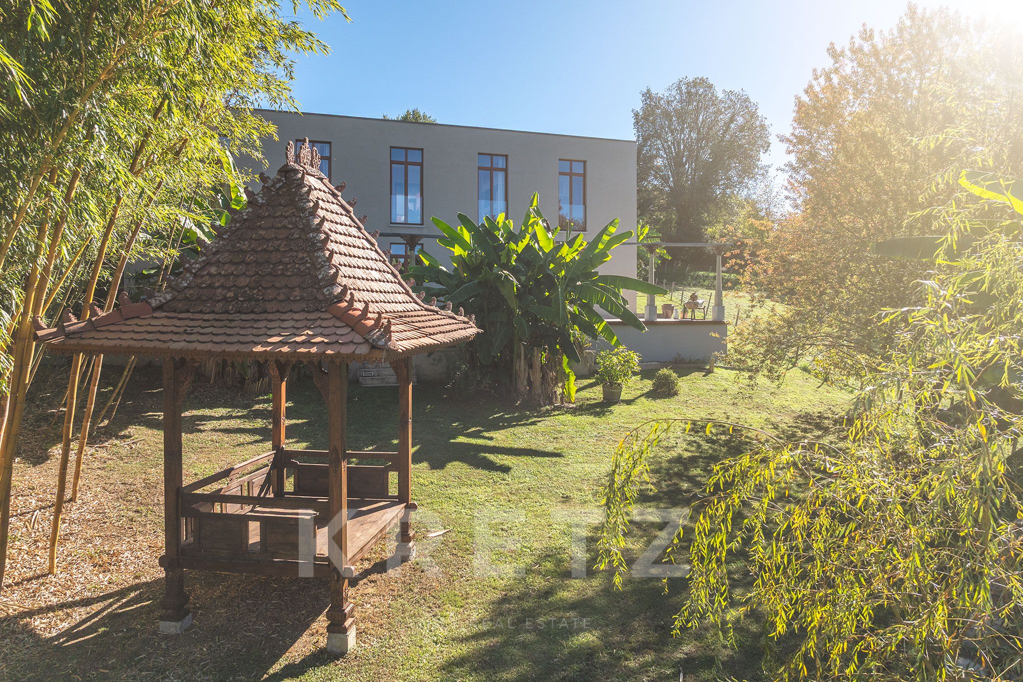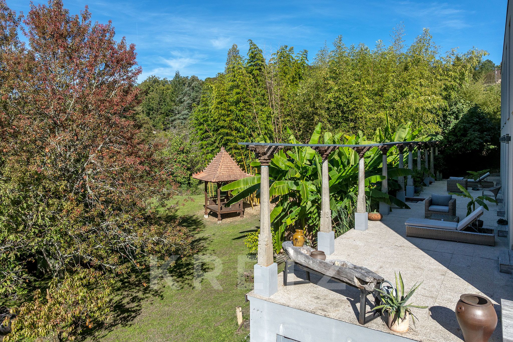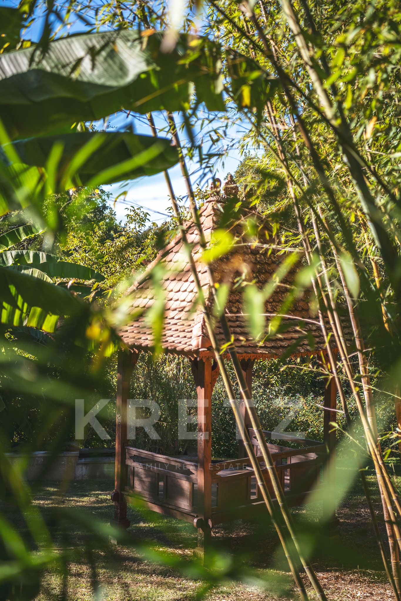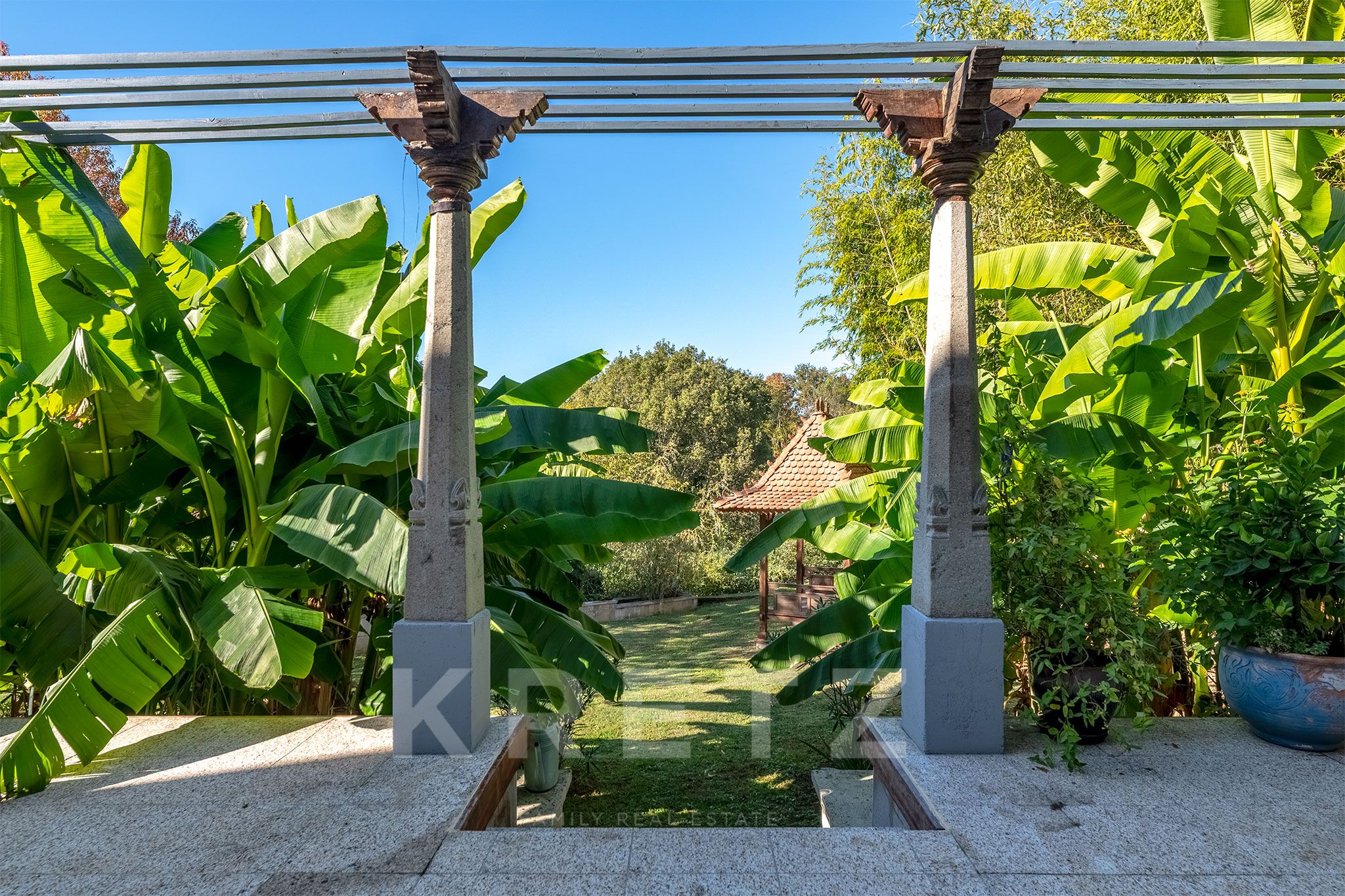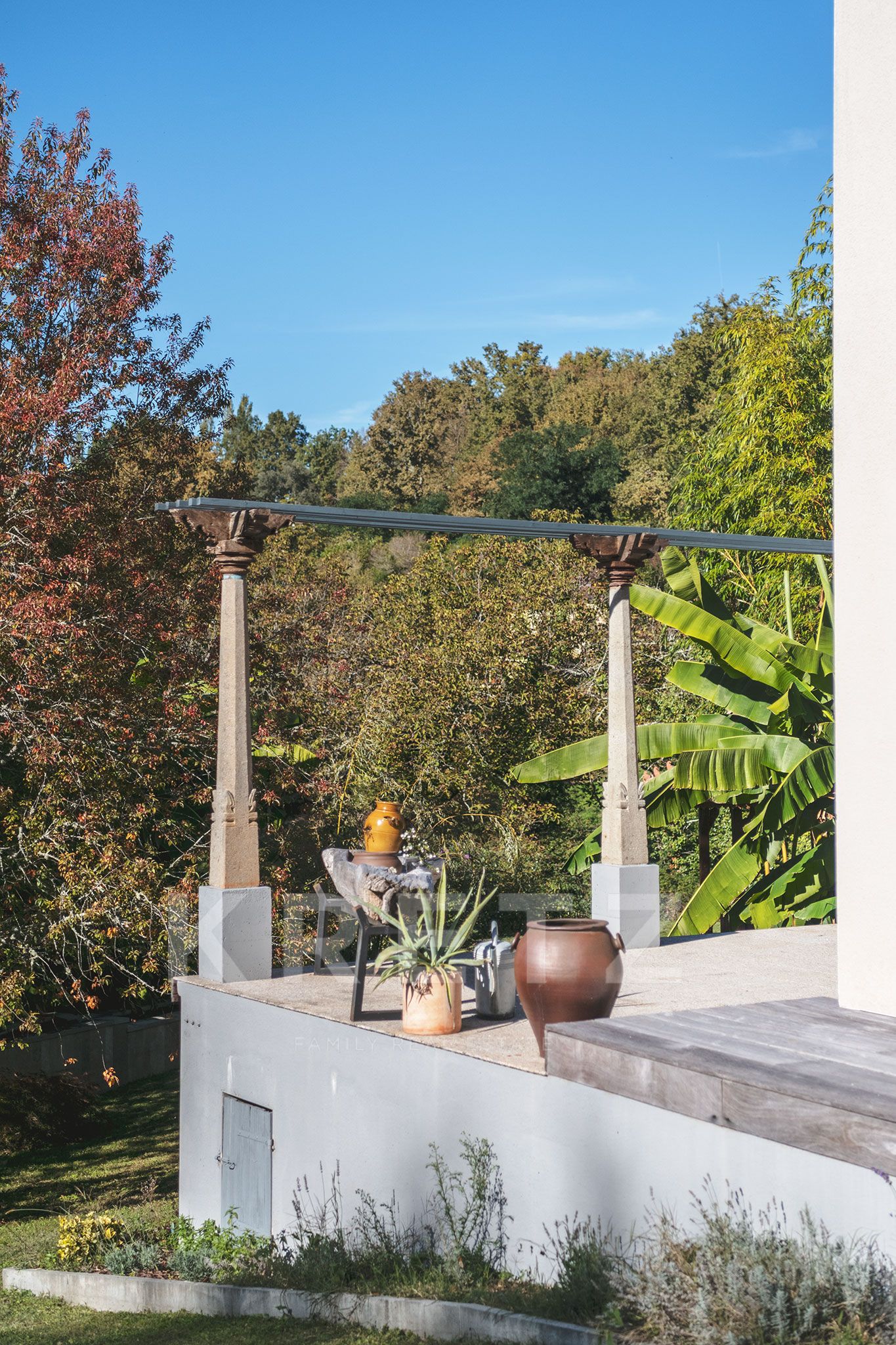 L’entrée se fait par une porte de style orientale au milieu d’un mur de pierre très périgourdin.