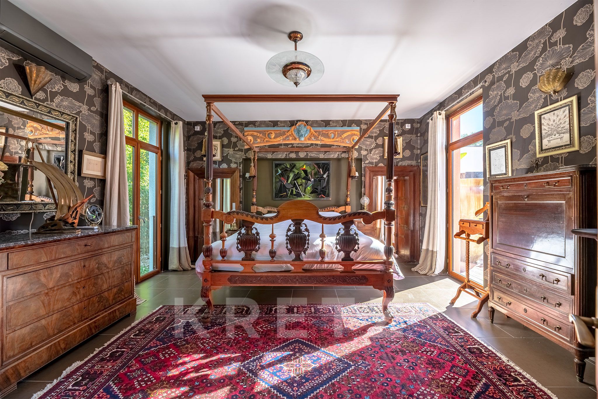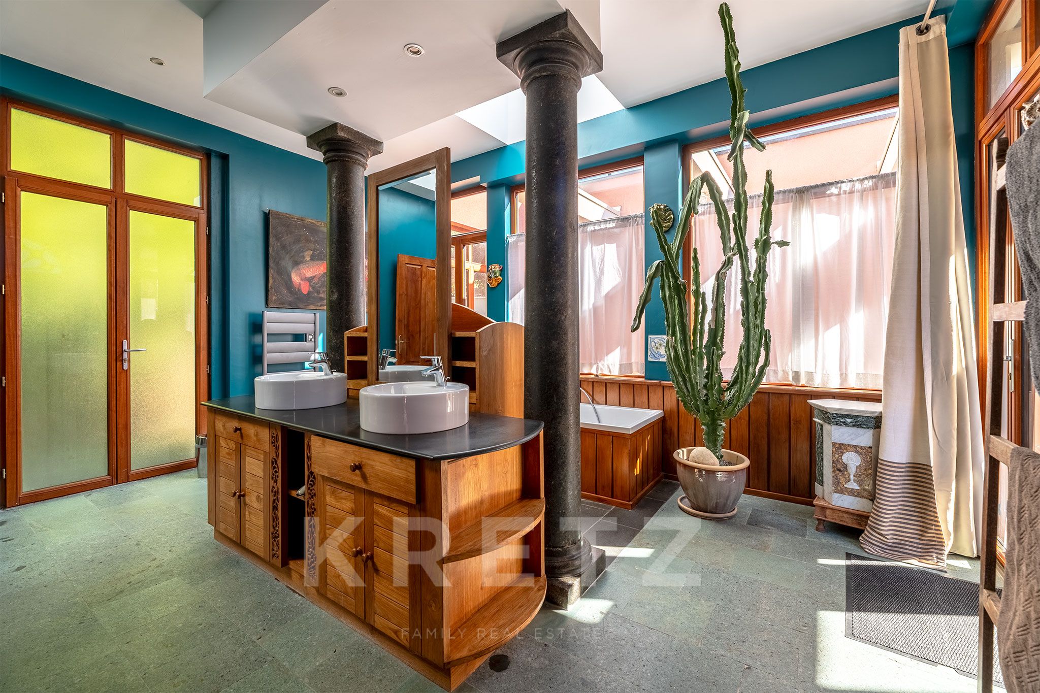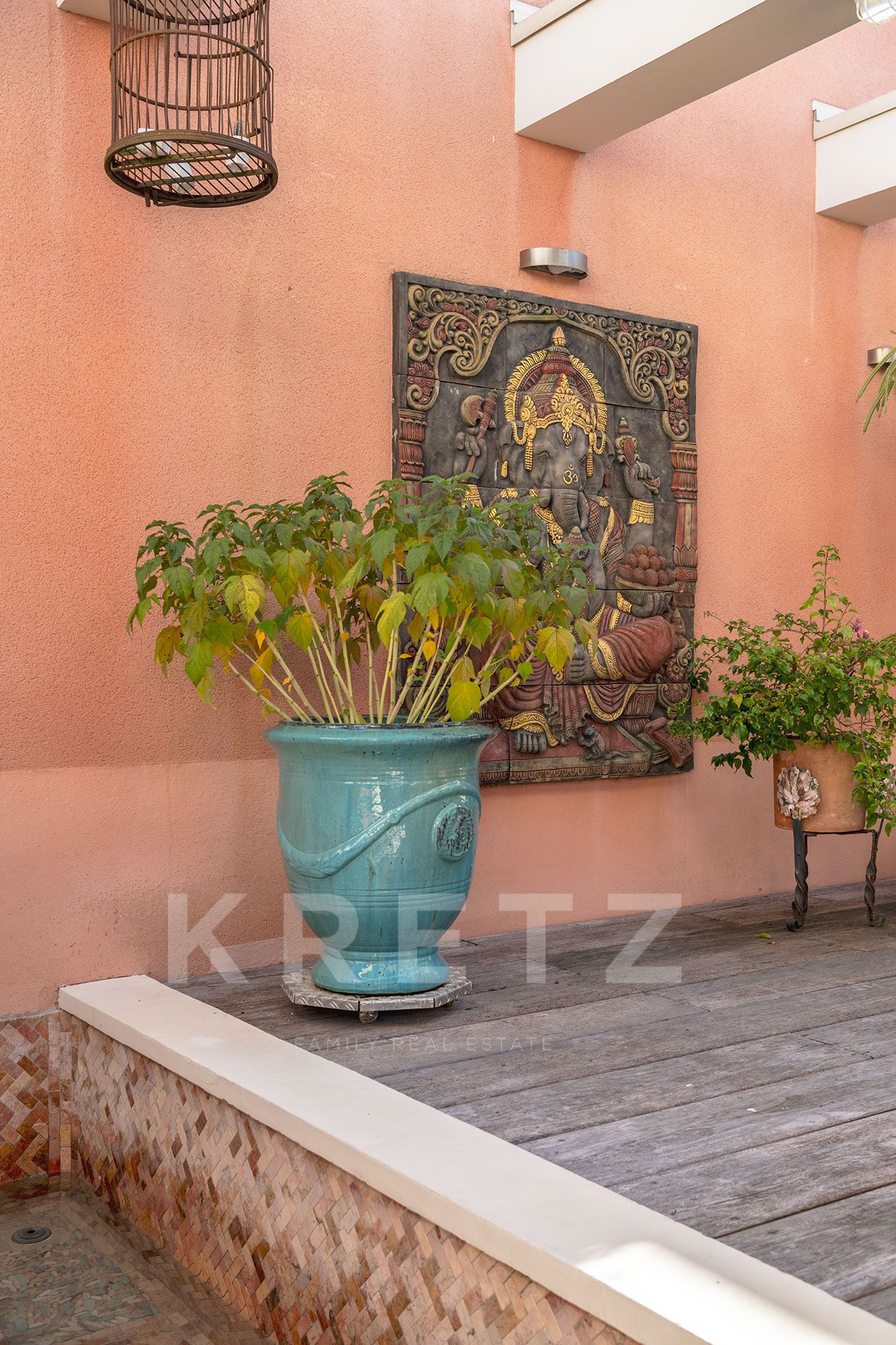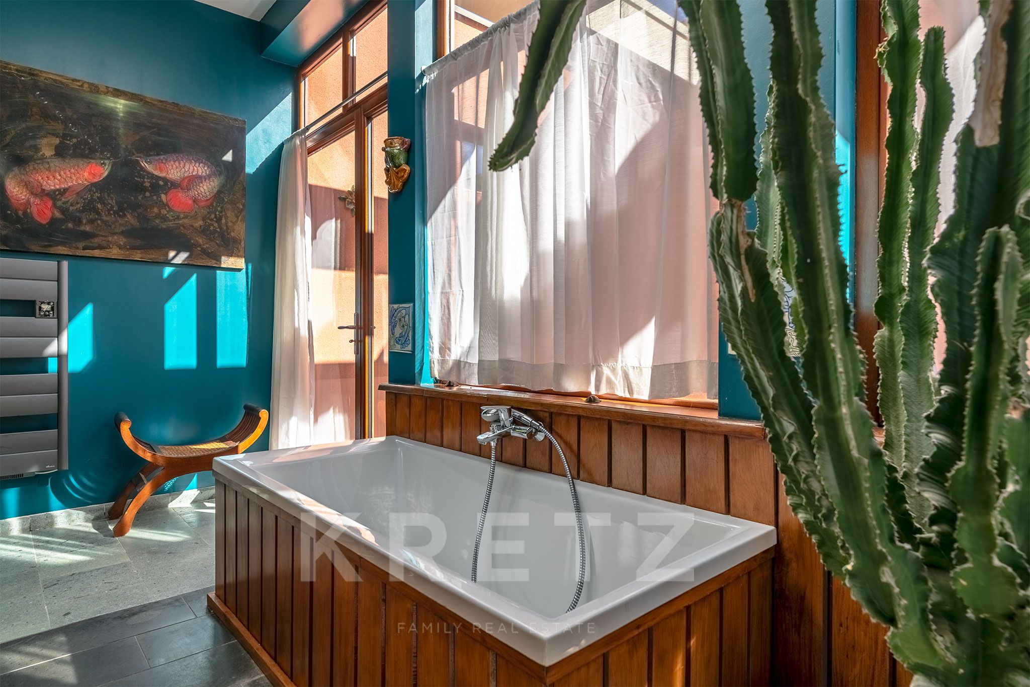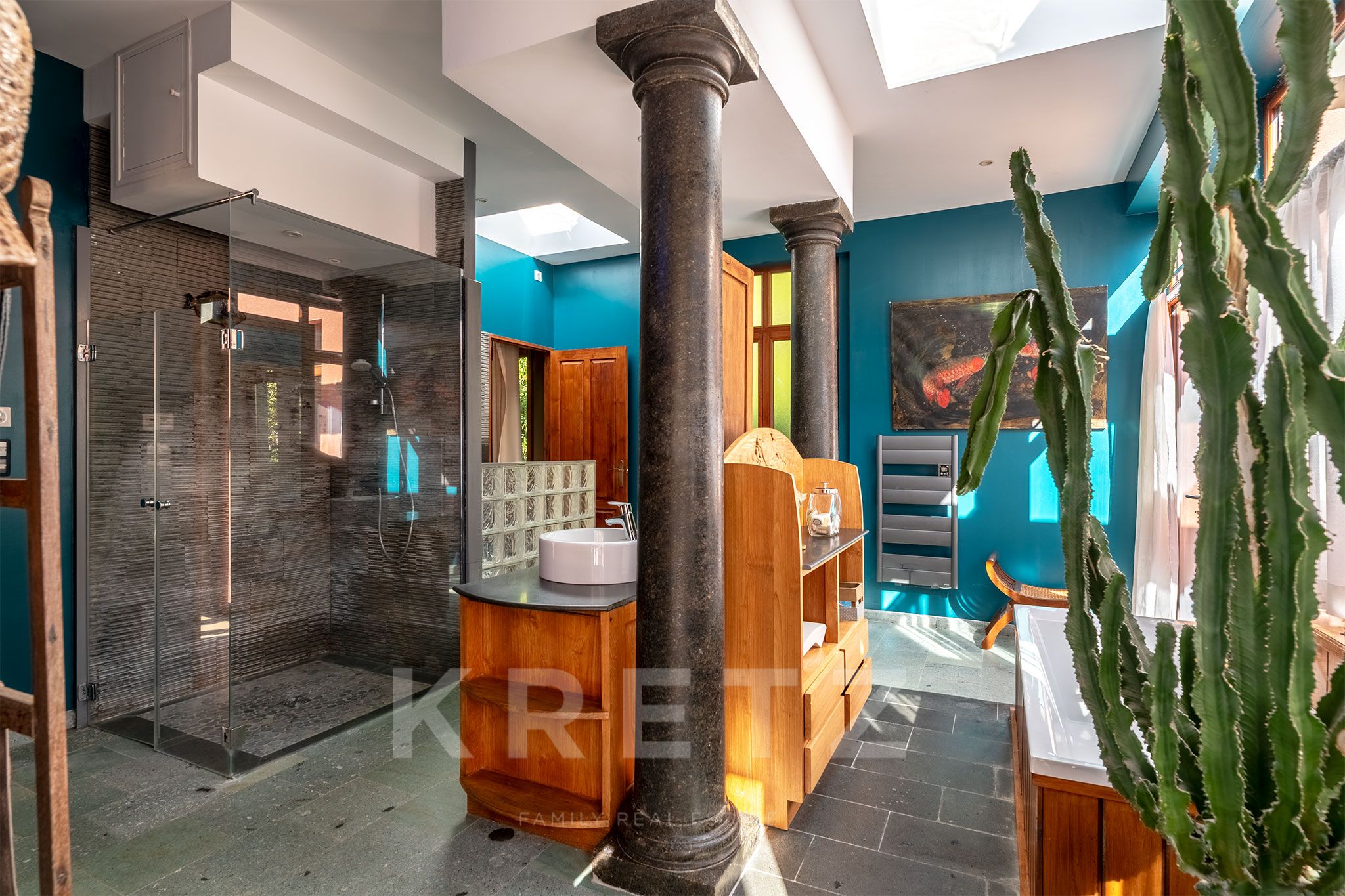 Le propriétaire, grand voyageur, a multiplié les influences au niveau de la décoration. Il y a de l’art partout et quel que soit l’endroit de la maison dans lequel on se situe, vous en prenez plein les mirettes.
