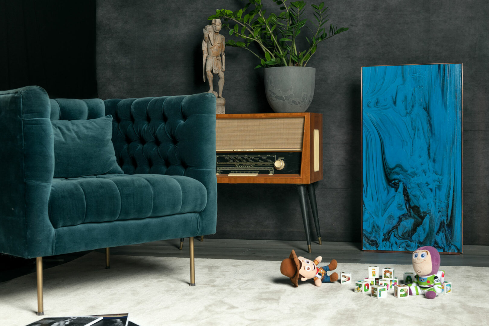 Après déballage je découvre une lampe bleue qui présente de magnifiques textures sombres sur la face avant. L’arrière de la lampe est marbré, dans des tons plutôt blanc cassé, ocre et orangés. Le pied de cette lampe n’est plus comme les premières en bois plutôt massif, c’est une simple lame de cuivre très discrète. Cela confère à la lampe un aspect plus léger et classieux.