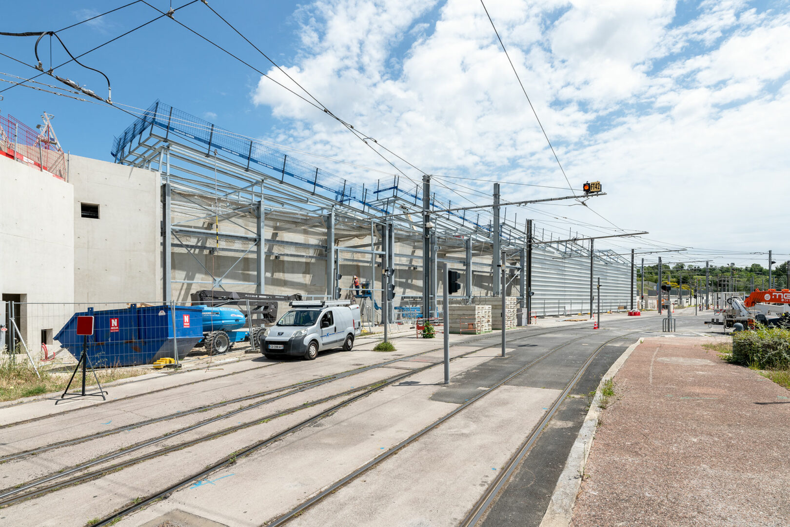 Direction Montpellier pour un reportage commandé par la société Giraud Serin, spécialisée dans la construction métallique de bâtiments industriels. Le chantier est situé au sein du dépôt de la TAM de Montpellier (transports urbains – tramways). La société Giraud Serin participe à la réalisation d’un grand hangar.
