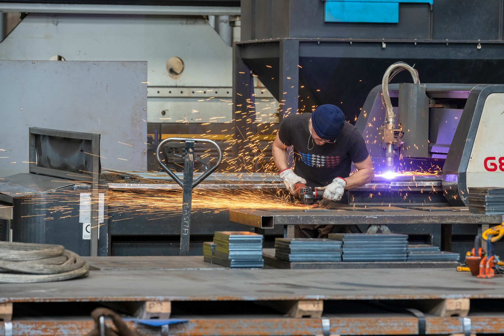 Chocs sourds et métalliques, crépitements et grésillements, hurlements du métal que l’on torture en le découpant et en le perforant… Rentre par la gauche le métal brut et sort par la droite des éléments formés et peints qui ne demandent plus qu’à être assemblés pour créer un hangar, un atelier, un gymnase, une école et tellement d’autres choses sortant de l’imagination des bureaux d’études.