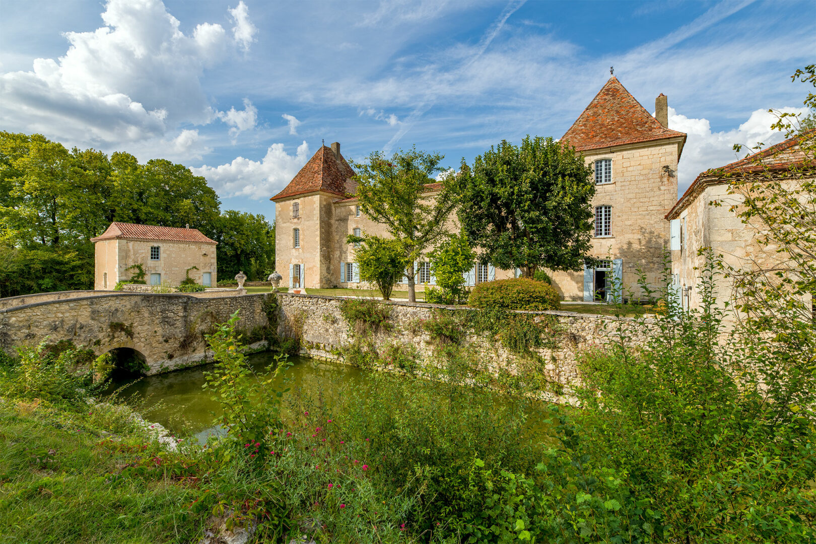 Le niveau d’eau des douves a baissé, l’herbe a roussi, le gros châtaigner accuse le coup mais le château conserve un charme fou.